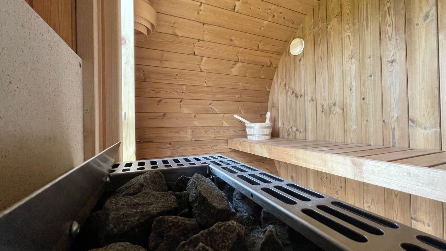 Im Erdgeschoss befindet sich neben dem Gäste-WC die offene und helle Wohnküche mit Ausgang auf die Terrasse und dem eingezäunten Garten. Für das besondere Highlight gibt es neben dem Gas-Kamin auch eine Fasssauna für einen entspannten Urlaub.
