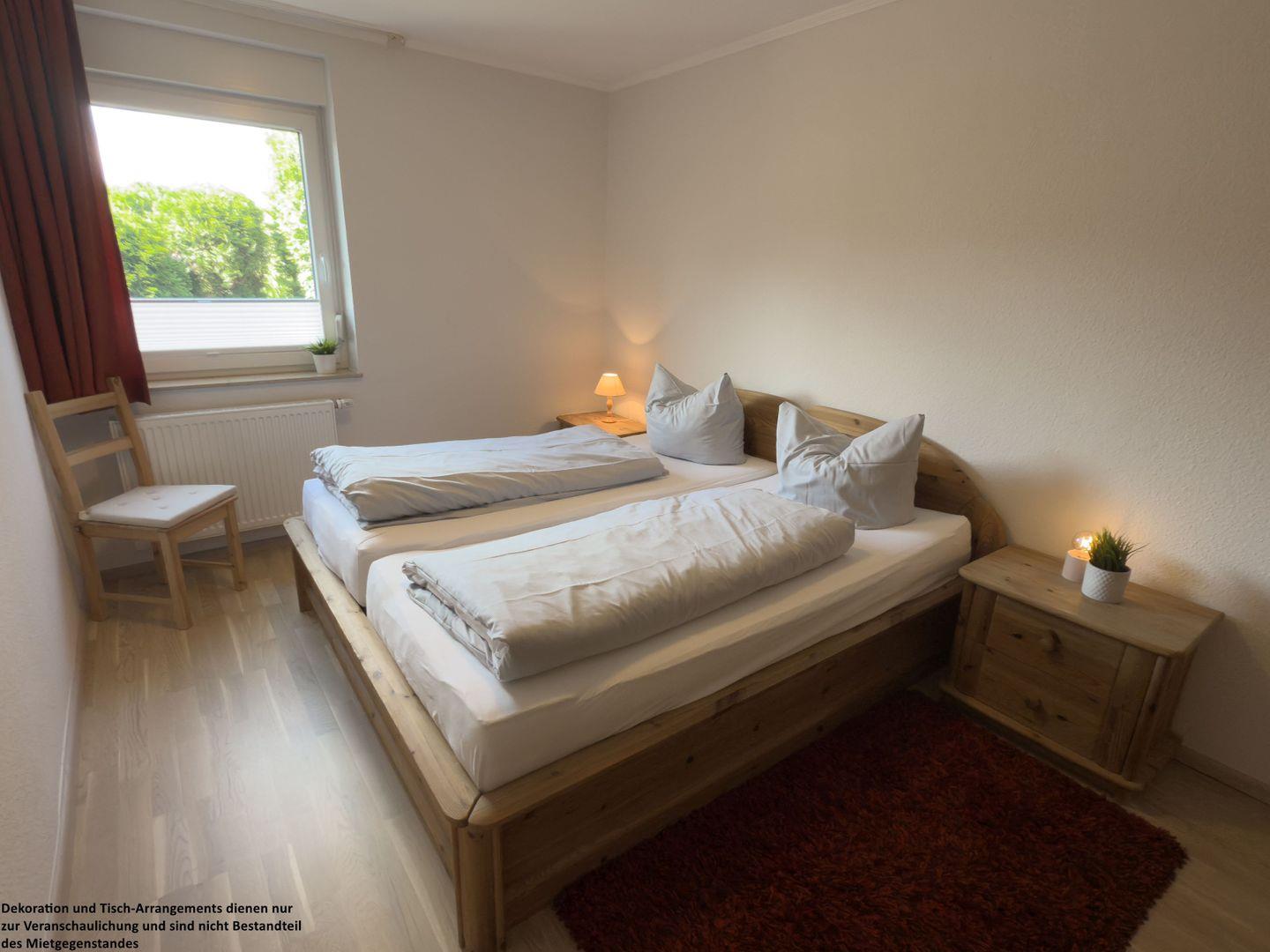 Das zweite Schlafzimmer verfügt über zwei komfortable Einzelbetten und greift ebenfalls die warmen Töne auf – ein idealer Rückzugsort für Kinder, Freunde oder weitere Familienmitglieder.