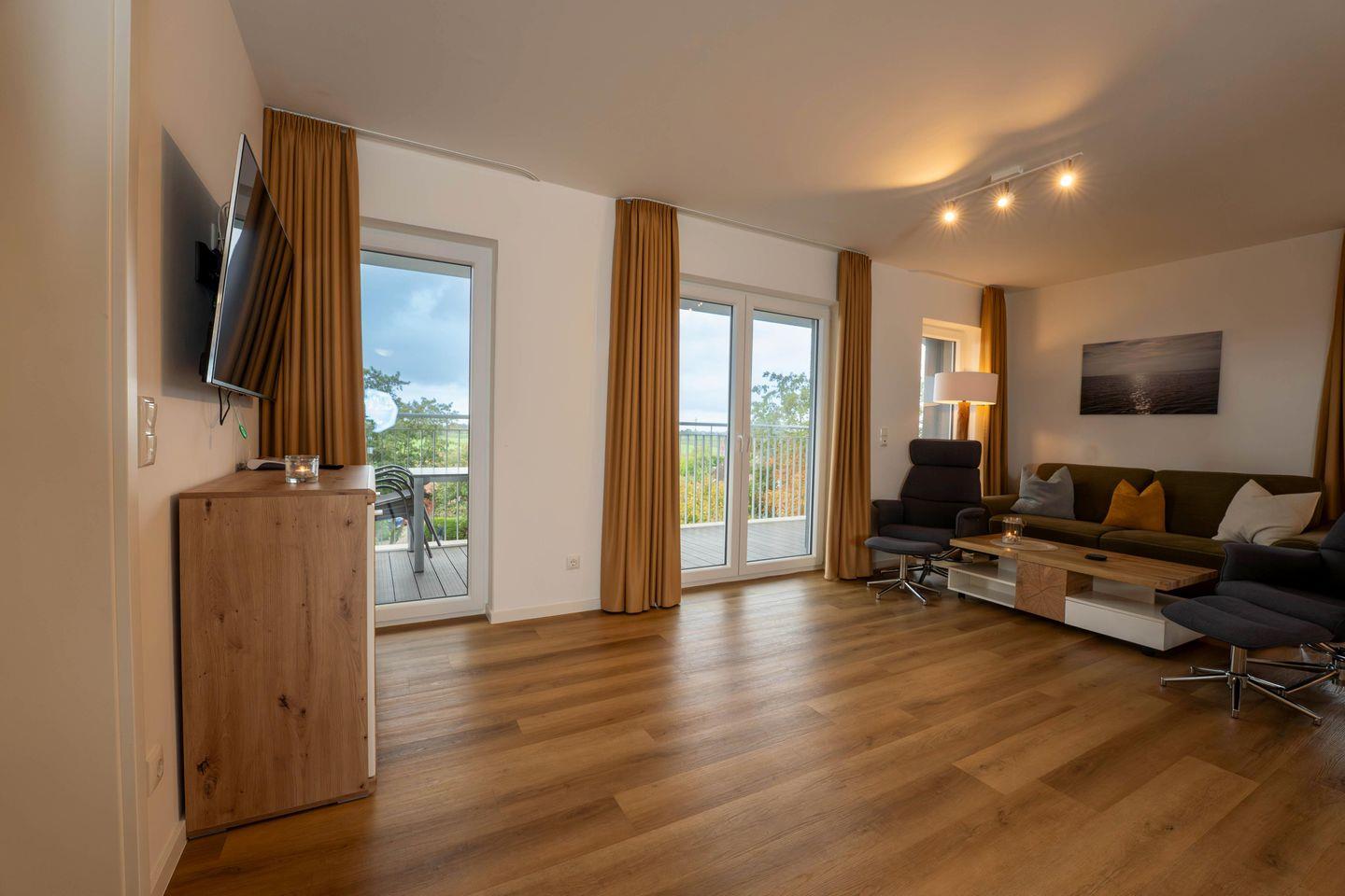 Großzügige Ferienwohnung mit Sauna und Balkon nahe der Nordsee, ideal für Familien und Hundebesitzer.