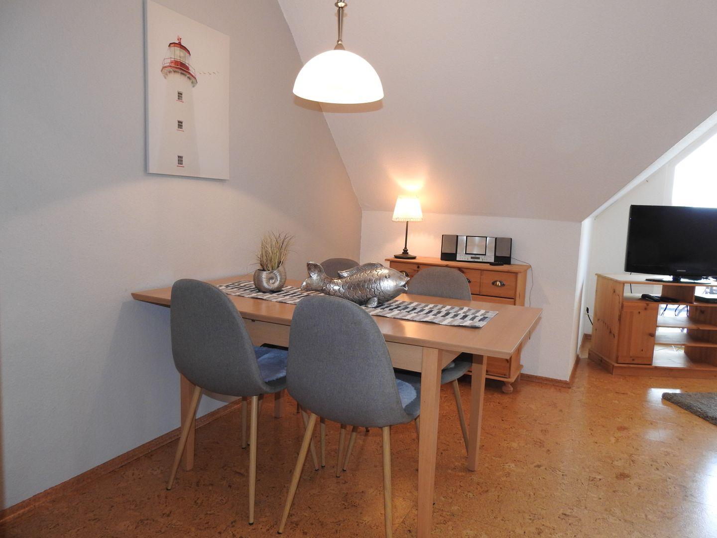 Ein markantes Merkmal der Ferienwohnung ist der überdachte und geschlossene Balkon, der einen angenehmen Gartenblick bietet. Dank Fliegengittern an den Fenstern und einem Sonnenschirm genießen Sie entspannte Stunden im Freien und profitieren gleichzeitig von einem wirkungsvollen Insektenschutz. Der Essbereich lädt zum gemeinsamen Speisen ein und wird durch eine umfassend ausgestattete Küche ergänzt. Hier stehen Ihnen neben einem Ceranherd, Backofen, Mikrowelle, Kühlschrank mit Gefrierfach (als Fach im Kühlschrank), Spülmaschine, Kaffeemaschine sowie einer Senseo-Espressomaschine auch ein Wasserkocher, Mixer, Toaster und ein Sandwichtoaster zur Verfügung.