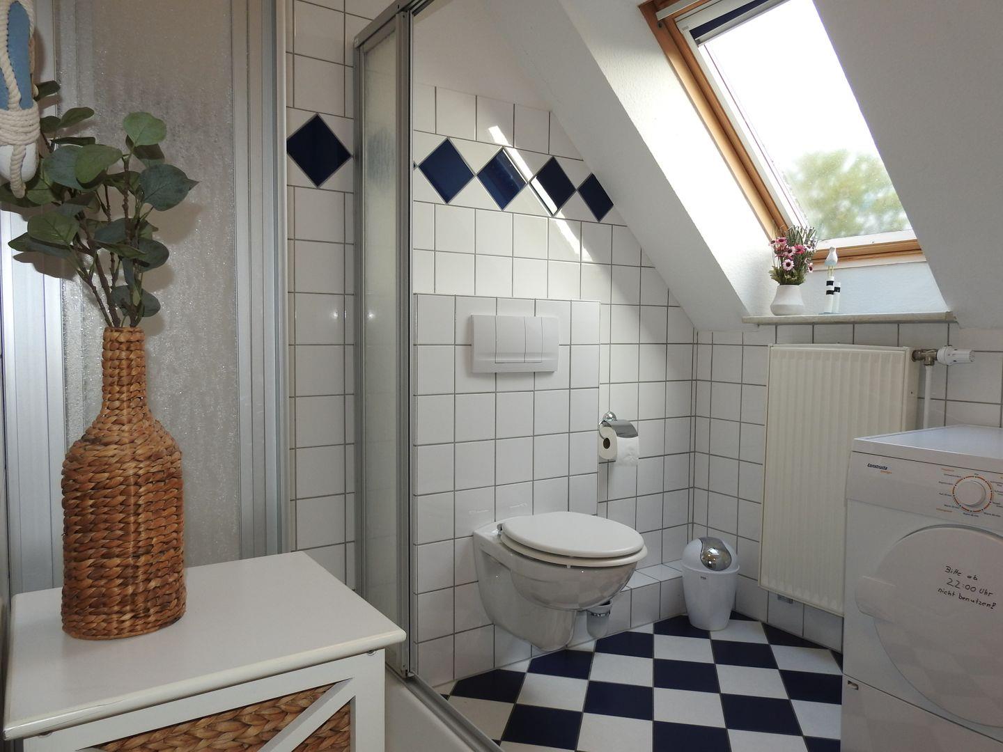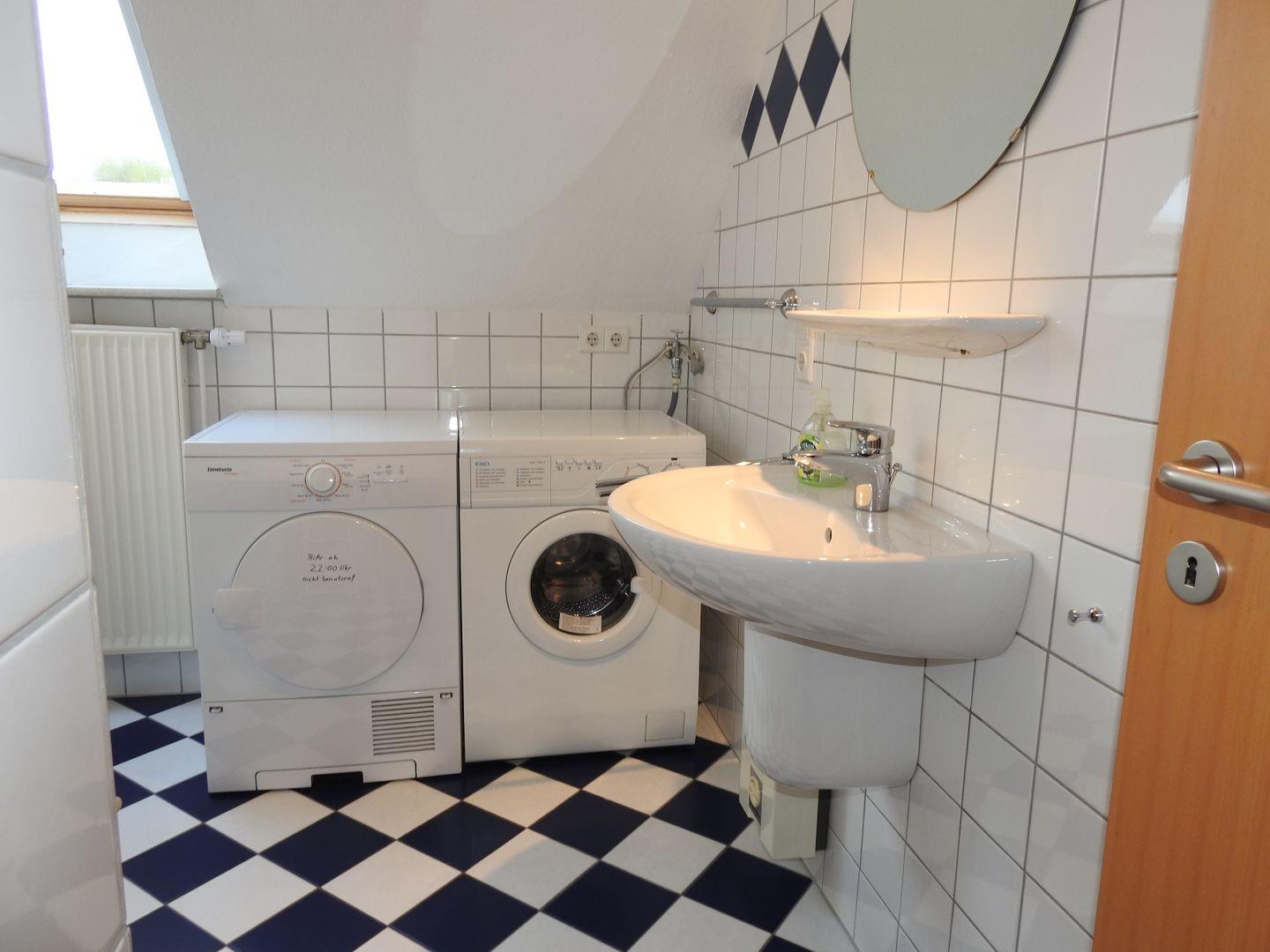 Das Badezimmer ist modern mit einer Dusche, Waschbecken, Waschmaschine (zur Eigennutzung) und Trockner ausgestattet. Ein Staubsauger sowie Bügelbrett und Bügeleisen stehen zur Verfügung, sodass auch längere Aufenthalte komfortabel gestaltet werden können.