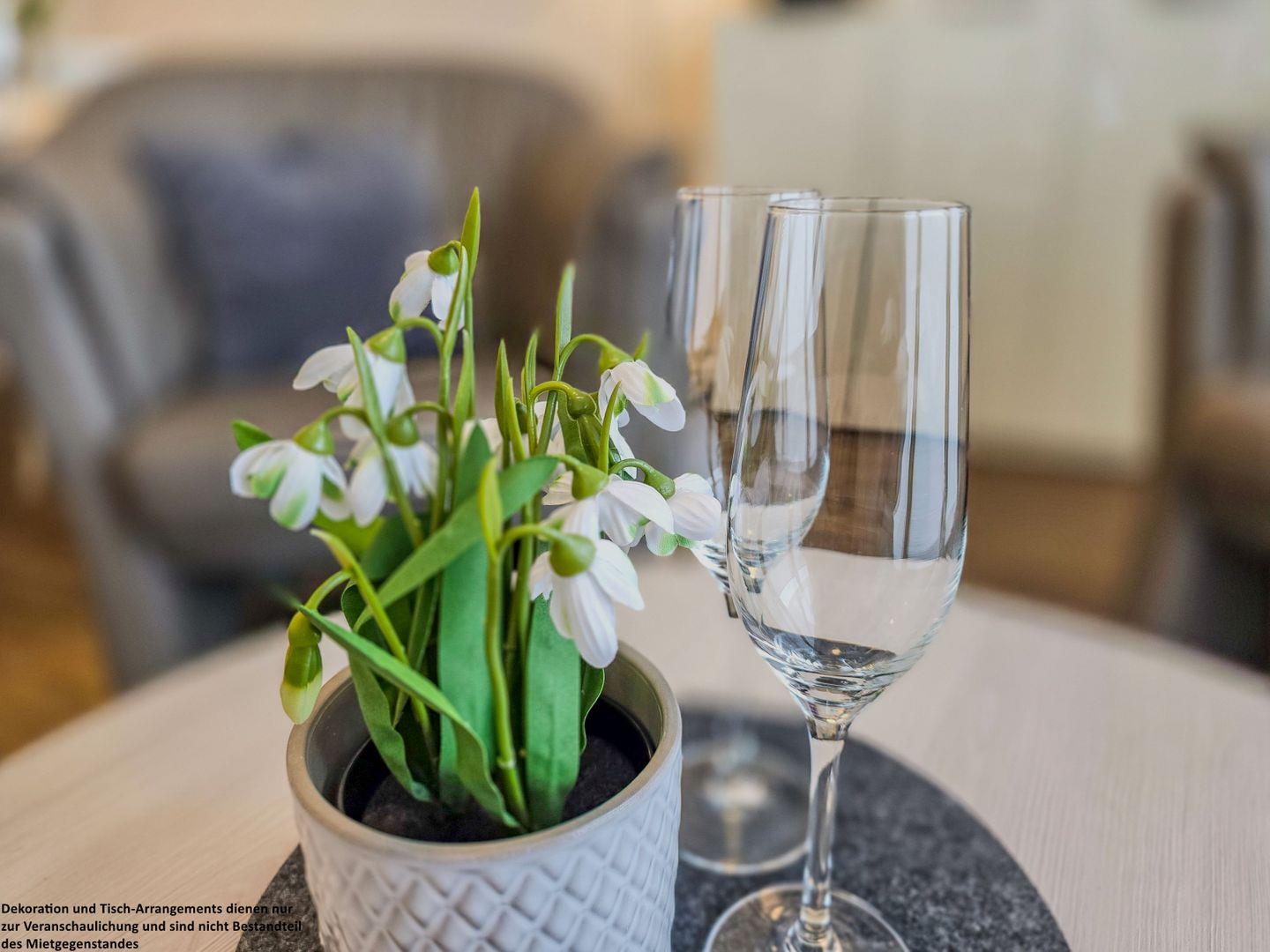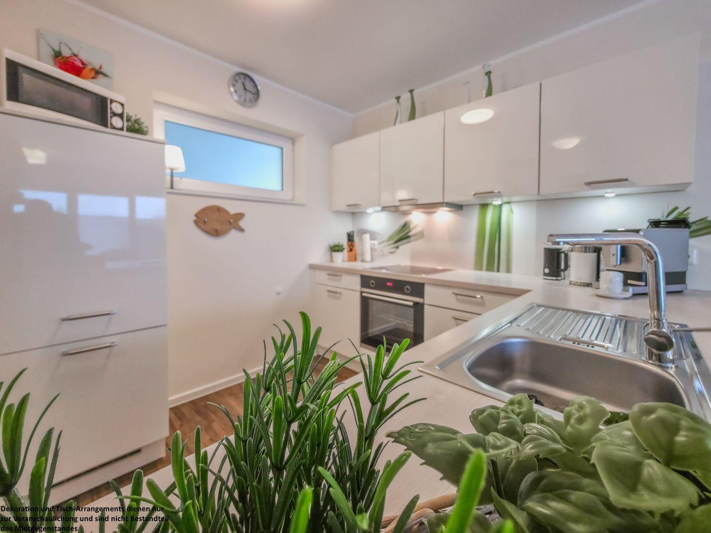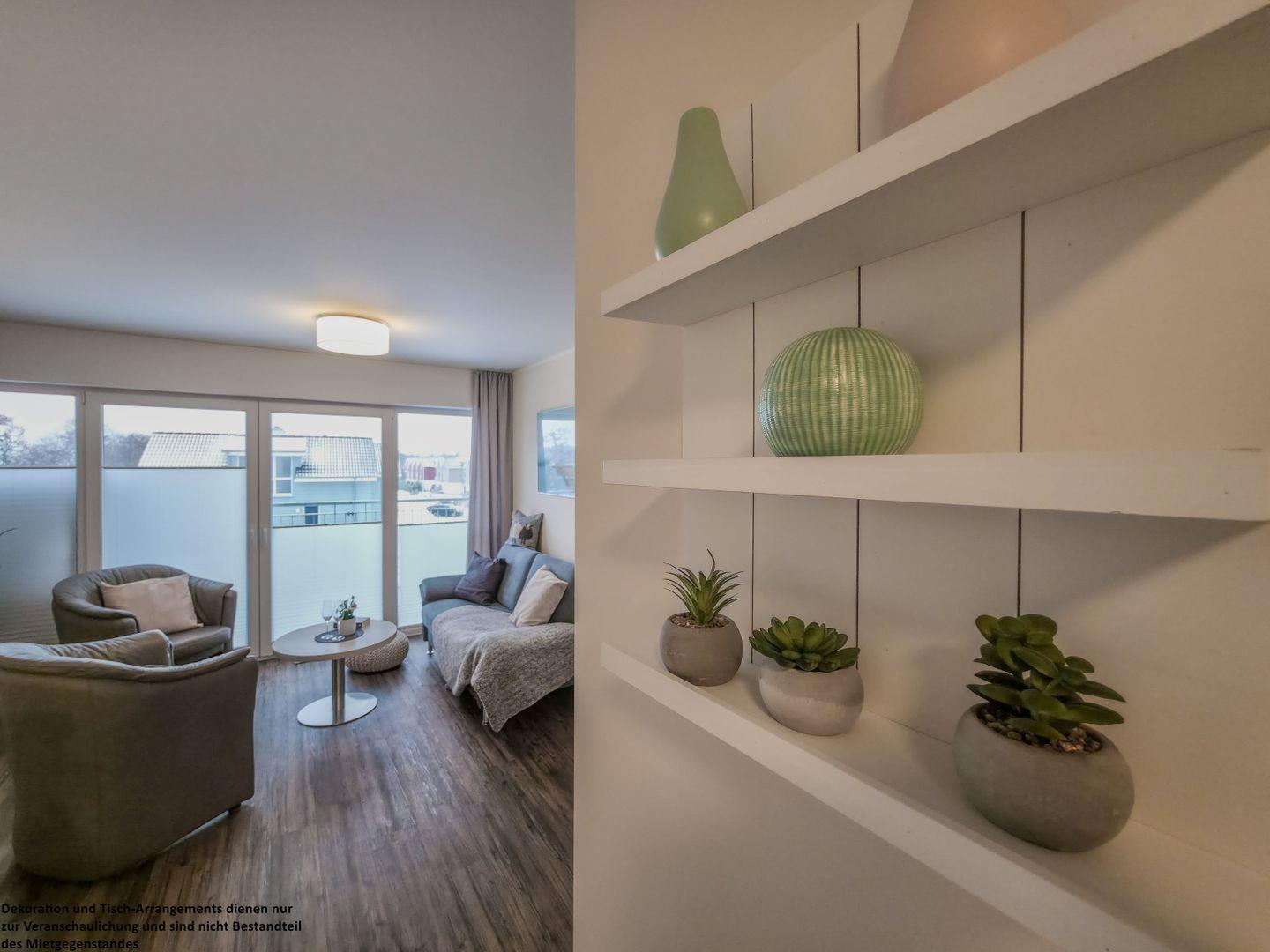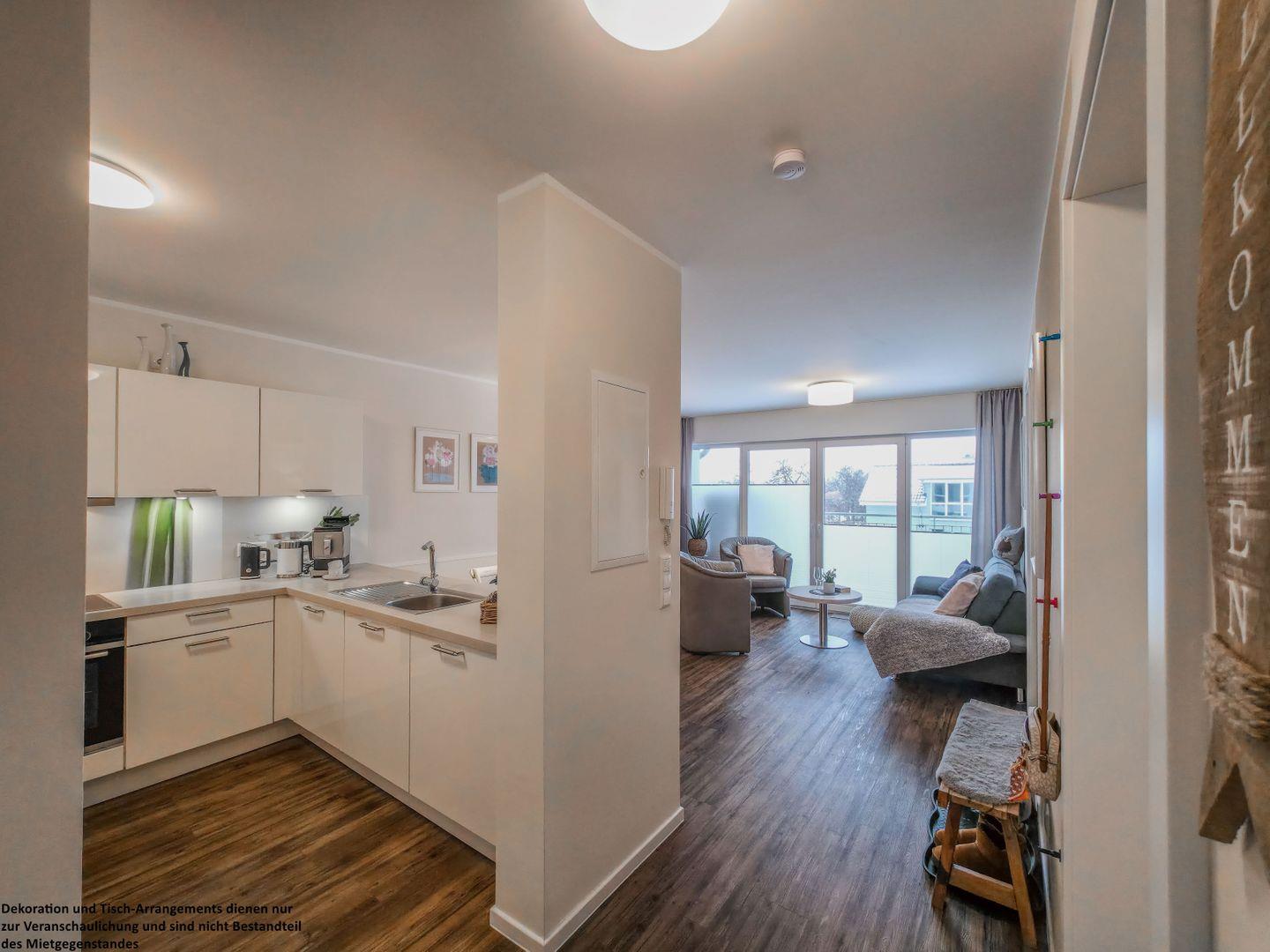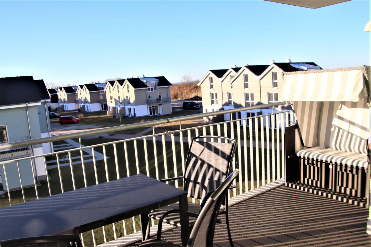 Das Herzstück der Wohnung ist der überdachte Balkon: Genießen Sie den weiten Ausblick, lassen Sie sich im Strandkorb nieder und spüren Sie den lauen Wind auf Ihrer Haut, während Sie den Tag bei einem Glas Wein ausklingen lassen. Alle Räume sind verdunkelbar, sodass Sie Ruhe und Erholung in vollen Zügen genießen können.