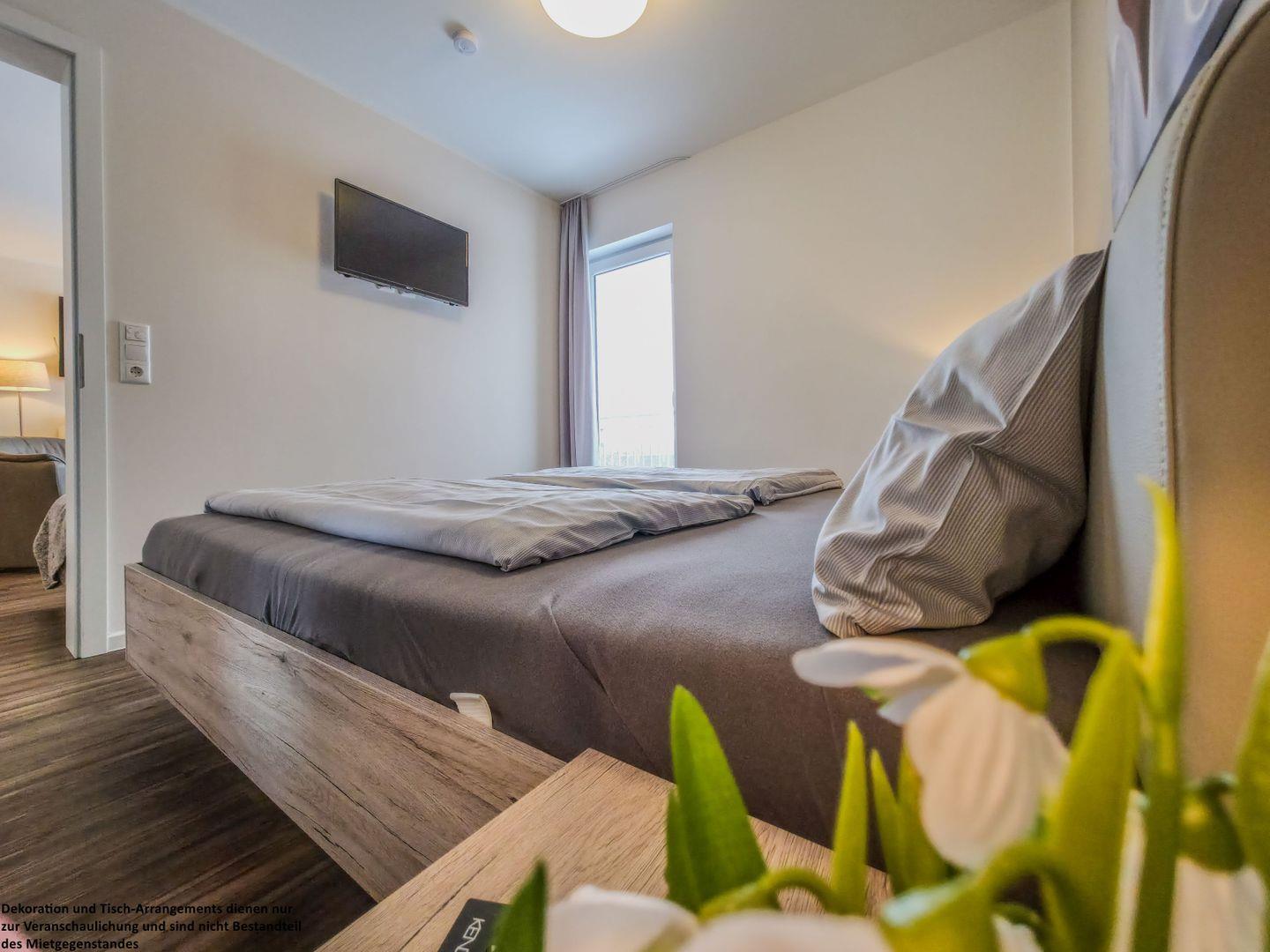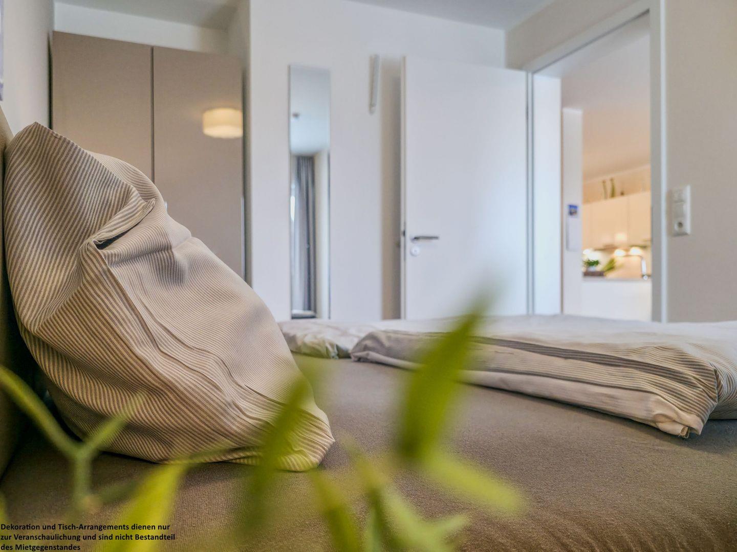 Im Schlafzimmer sorgt das komfortable Doppelbett für erholsamen Schlaf, und auch hier können Sie abends noch gemütlich fernsehen. Der geräumige Kleiderschrank hält ausreichend Platz für Ihre Kleidung bereit.