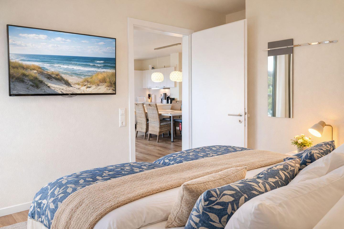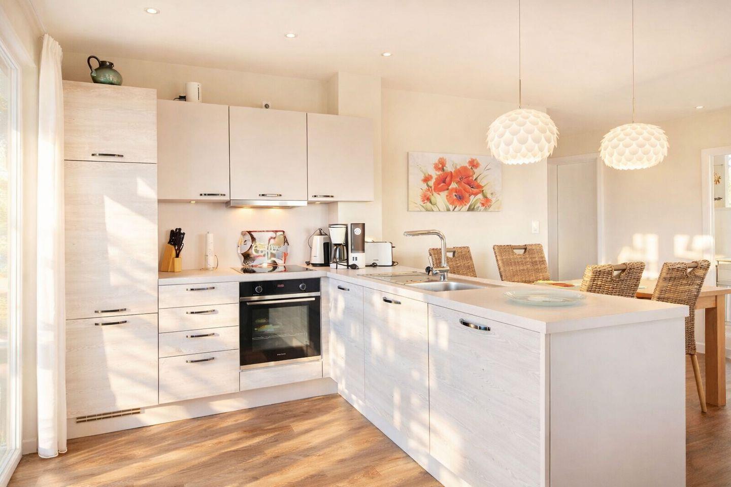 Herzlich willkommen am Meer! Hinter dem Deich erwartet Sie unsere lichtdurchflutete Neubau-Ferienwohnung, die mit moderner, hochwertiger Ausstattung und viel Komfort ideale Voraussetzungen für einen erholsamen Urlaub bietet. Die Wohnung ist für bis zu vier Personen ausgelegt und umfasst einen gemütlichen Wohnbereich mit Essplatz, eine offene, vollständig ausgestattete Einbauküche sowie zwei Schlafzimmer mit komfortablen Doppelbetten, Nachtkonsolen und geräumigen Kleiderschränken. Bodentiefe Fenster mit dichten Vorhängen ermöglichen eine individuelle Lichtregulierung.