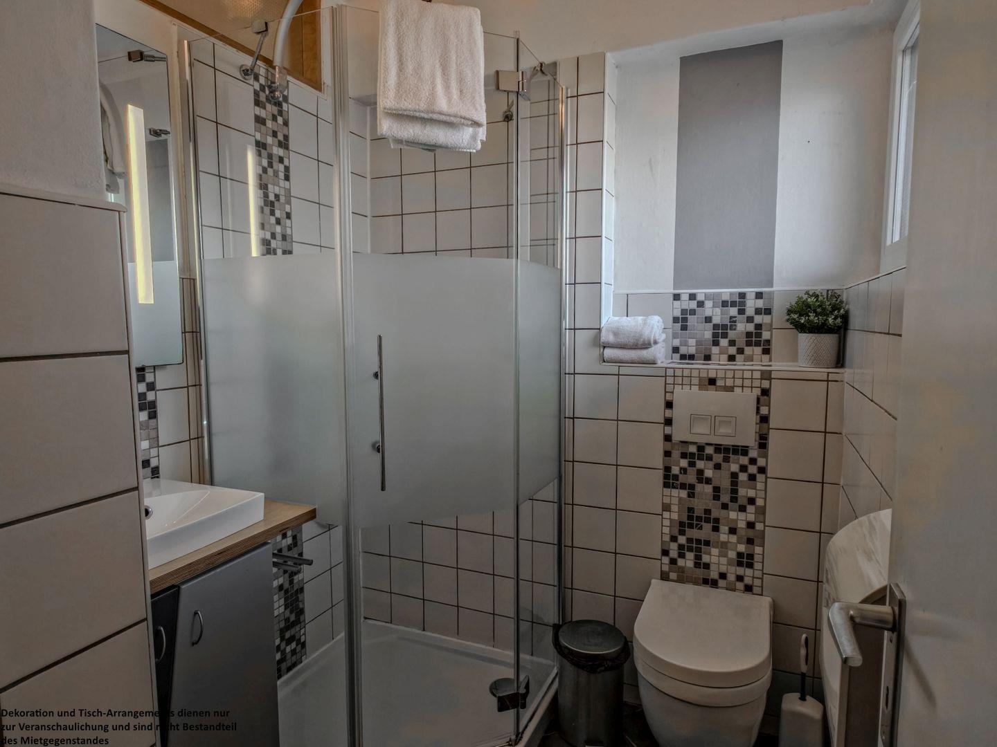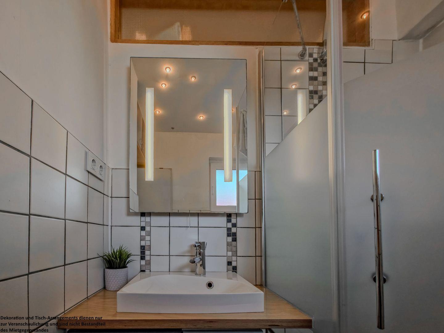 Das modern geflieste Badezimmer bietet ausreichend Platz für Ihre morgendliche Frische und einen entspannten Start in den Tag.
