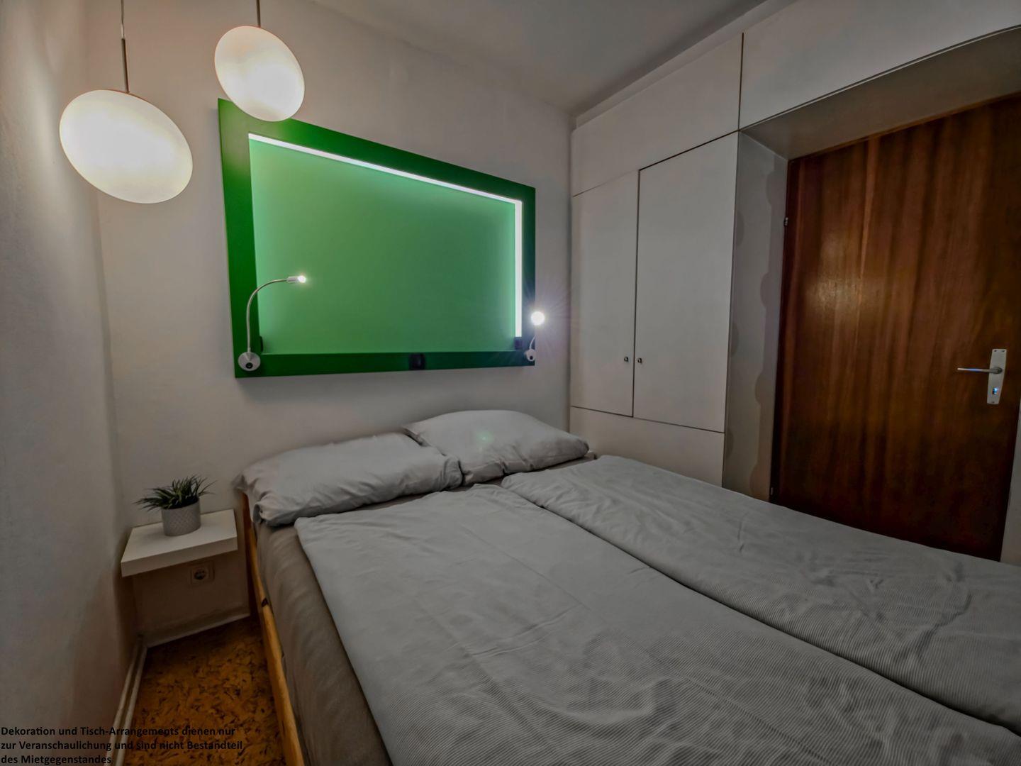 Vom Wohnzimmer aus erreichen Sie das kleine, charmante Schlafzimmer. Das 160 × 200 cm große Bett mit zwei Einzelmatratzen sorgt für erholsamen Schlaf. Trotz seiner kompakten Größe bietet der Raum zusätzlich Platz für einen Kleiderschrank. Ein kleines Fenster lässt sanftes Tageslicht hinein – hier schlafen Sie klein, aber fein.