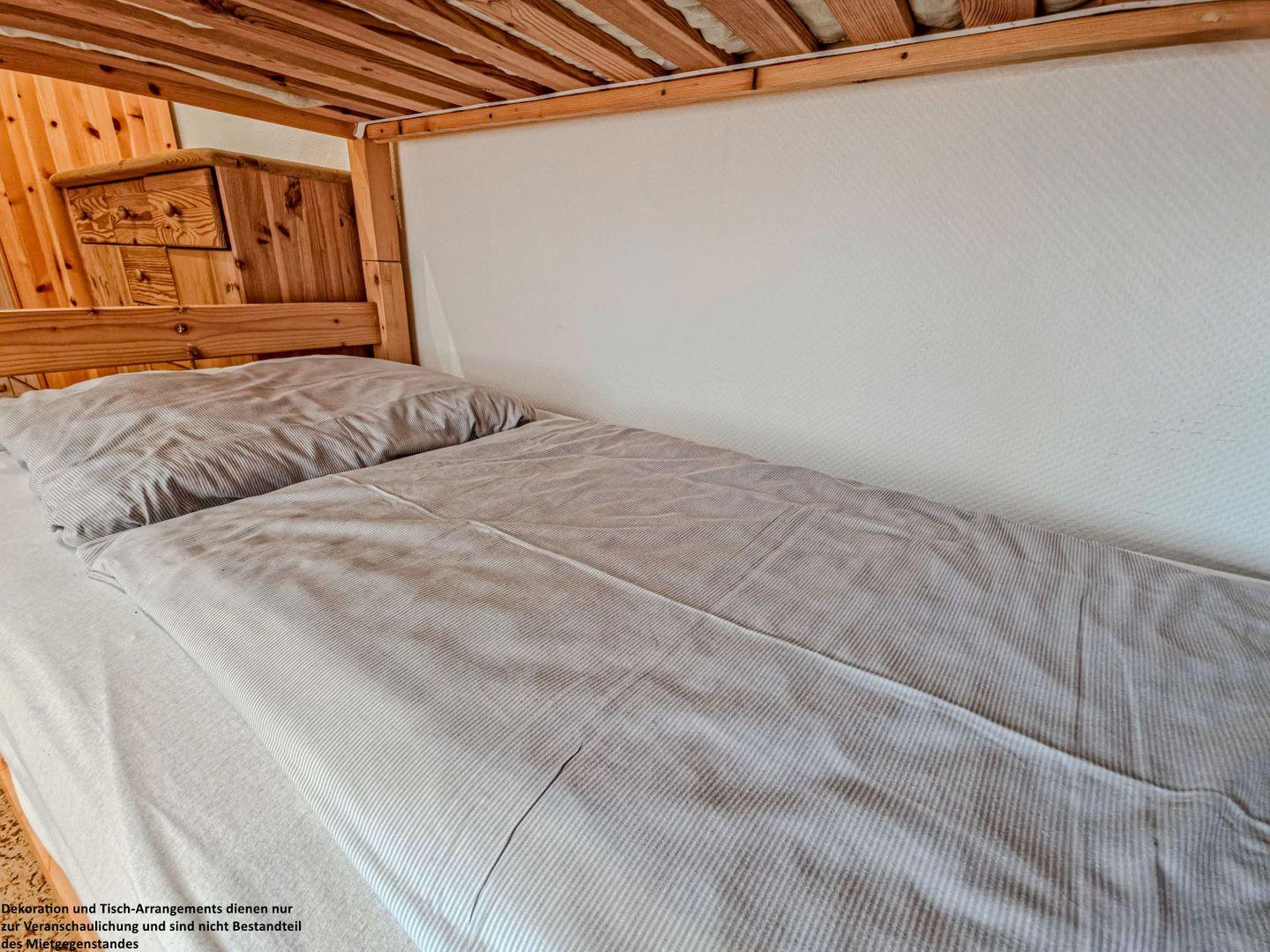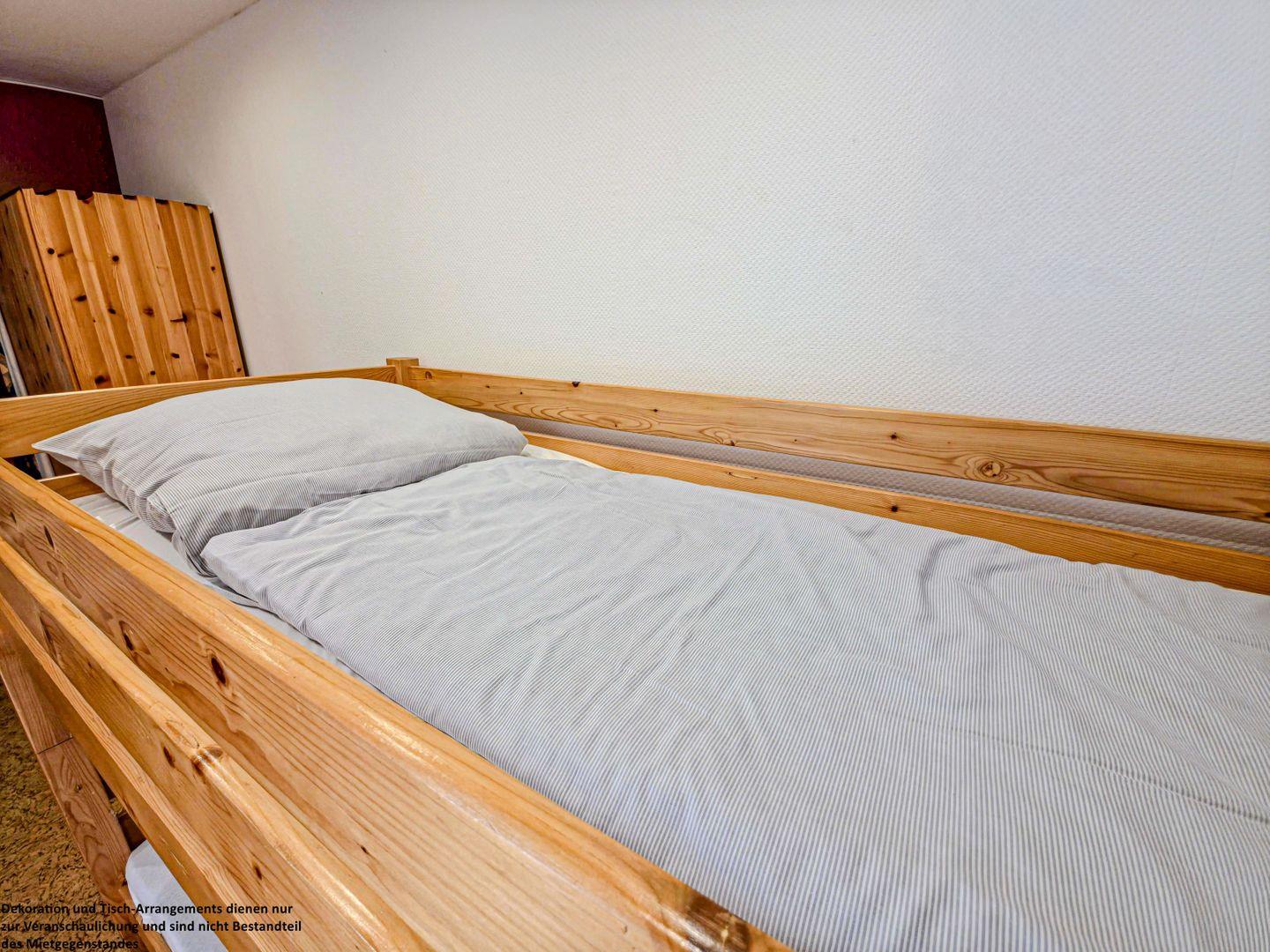 Im zweiten Schlafzimmer steht ein Etagenbett sowie eine Kommode zur Verfügung – ideal für Kinder oder weitere Gäste. Das Fenster lässt sich mit einer Außenrolllade verdunkeln, sodass einer ruhigen Nacht nichts im Wege steht.