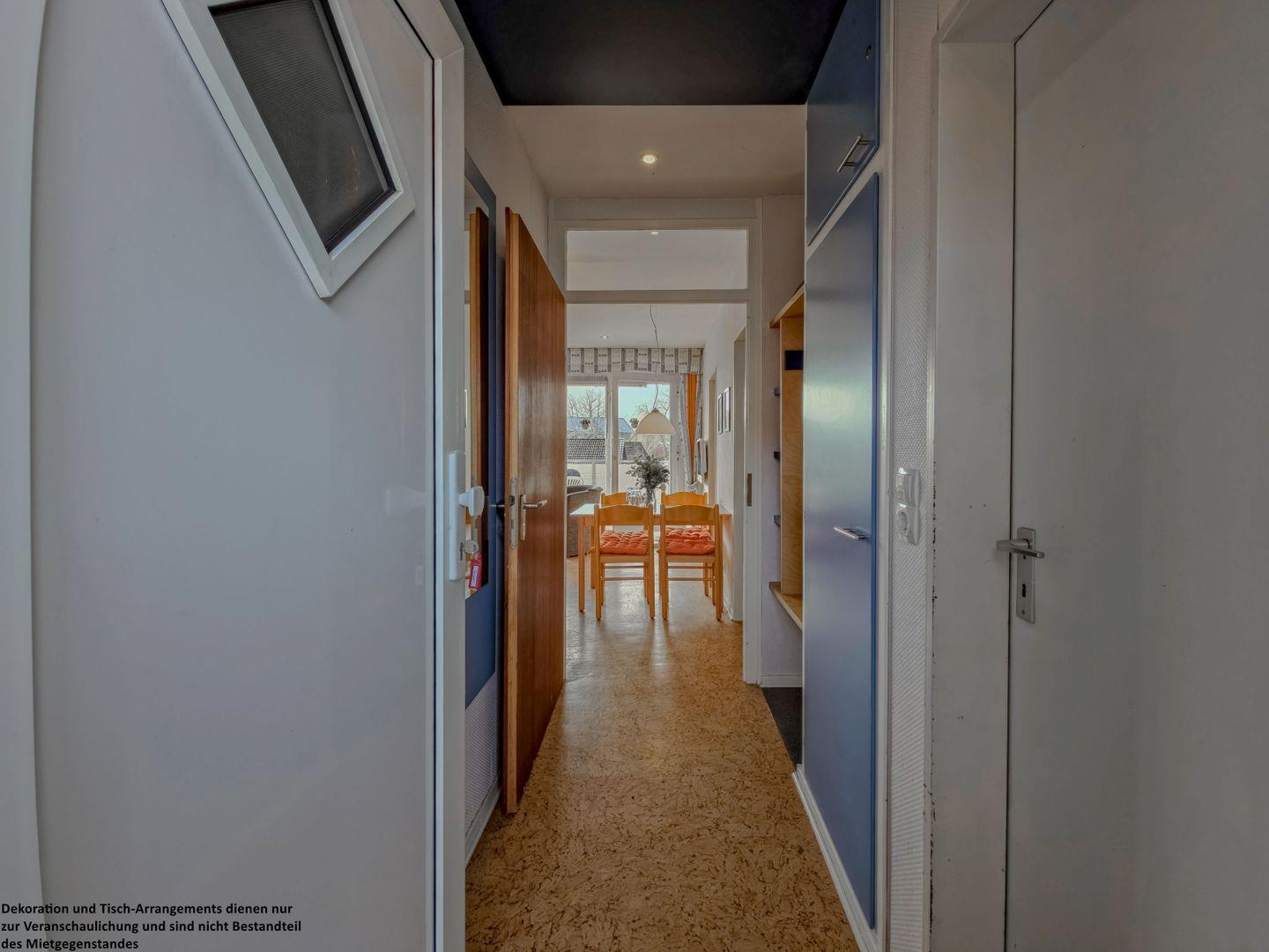 Schon der kleine Flur heißt Sie willkommen und bietet Platz für Schuhe und Garderobe – perfekt, um anzukommen und direkt in den Urlaubsmodus zu wechseln.