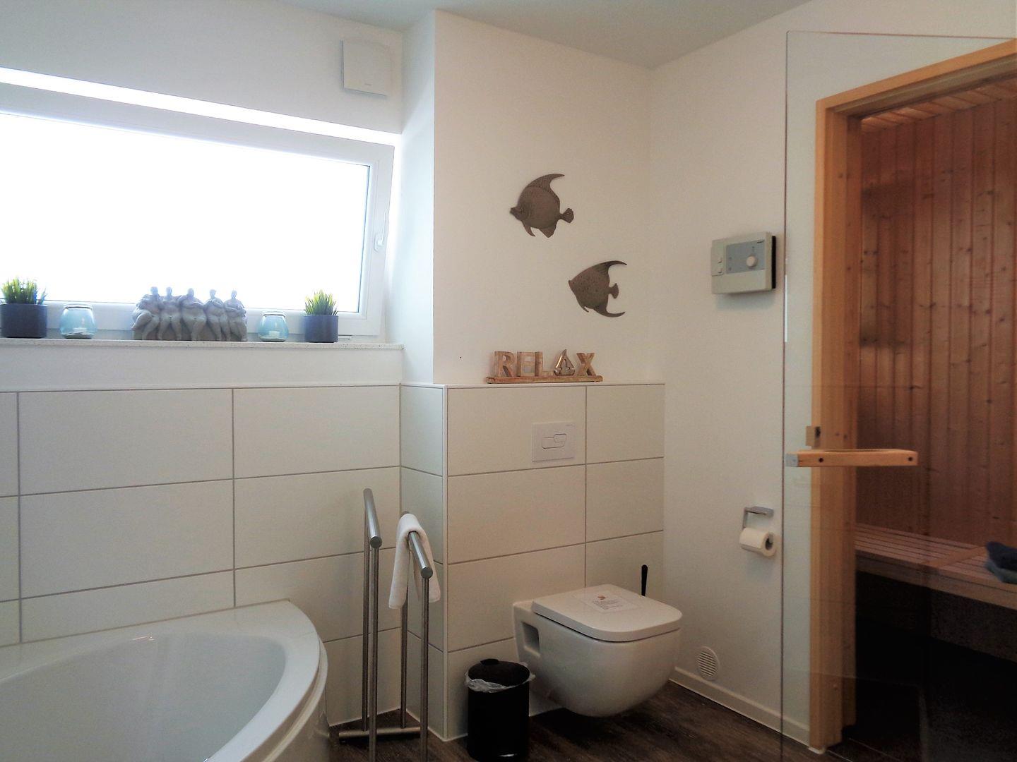 Eine Sauna, eine ebenerdige Dusche und eine Badewanne bieten den nötigen Komfort zur Erholung.