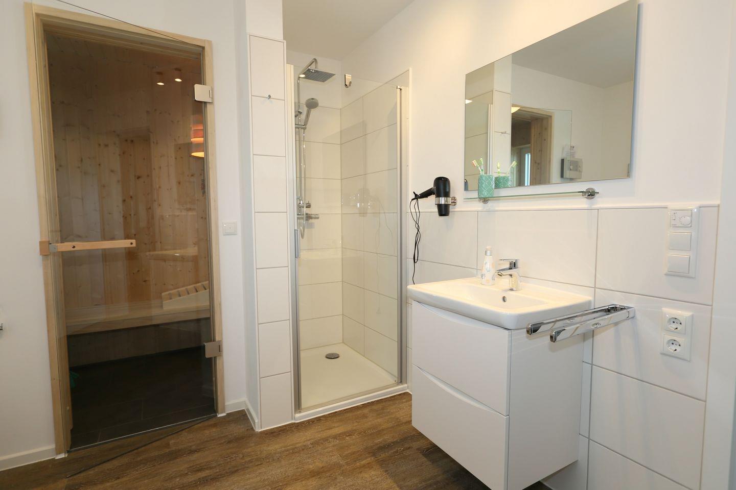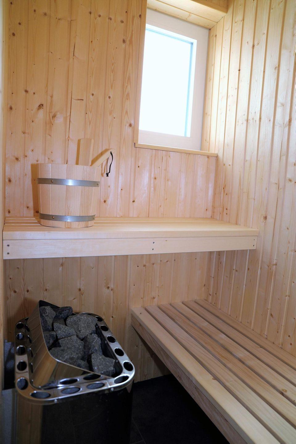 Eine Sauna, eine ebenerdige Dusche und eine Badewanne bieten den nötigen Komfort zur Erholung.