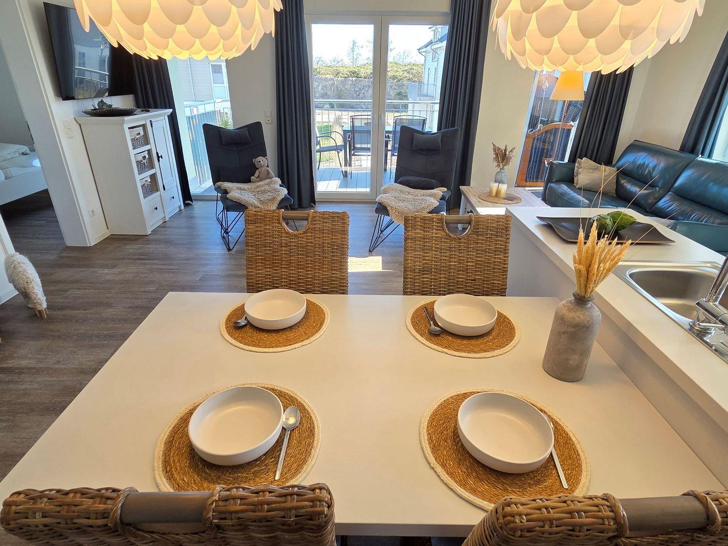 Ausgestattet mit einem Schlafsofa, Couchtisch und zwei Sessel, besticht der Wohnbereich durch seine integrierte Küchenzeile und seinem großzügigen Esstisch mit vier Stühlen.