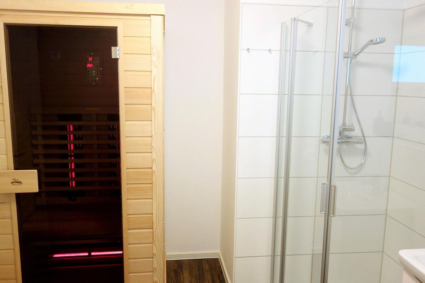 Das Badezimmer ist sehr großzügig geschnitten und mit einer Regendusche und einer Infrarotkabine ausgestattet.