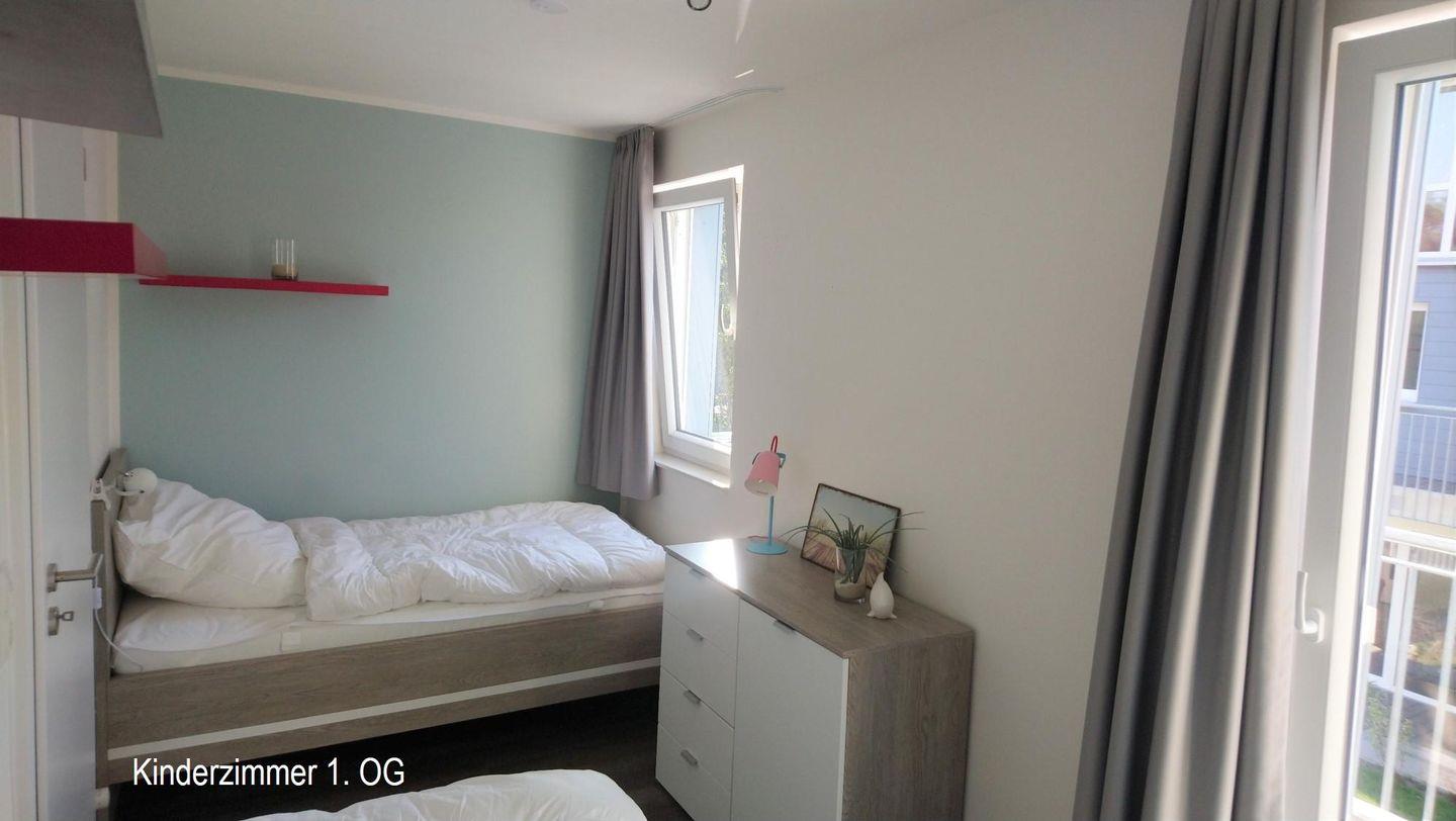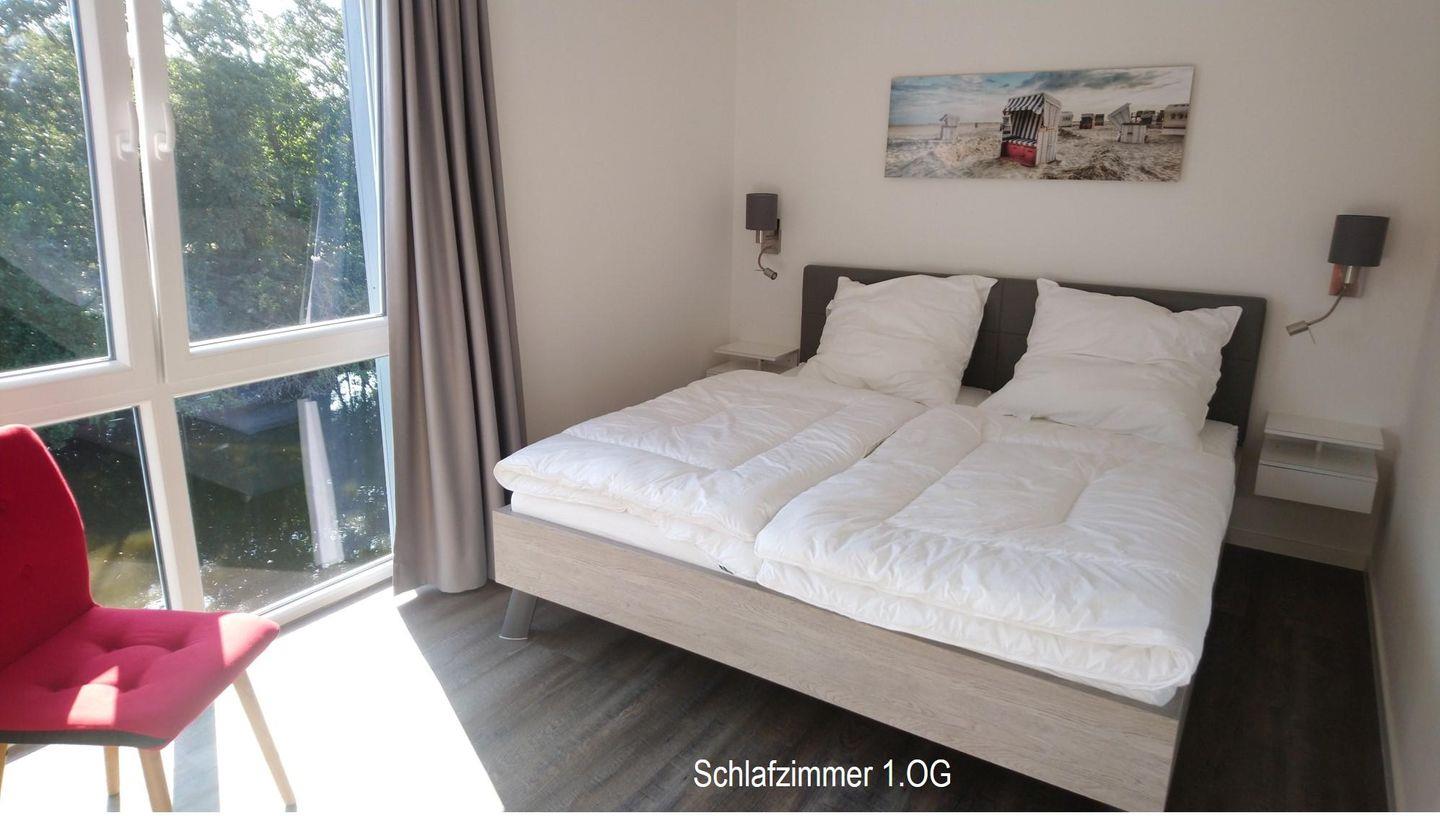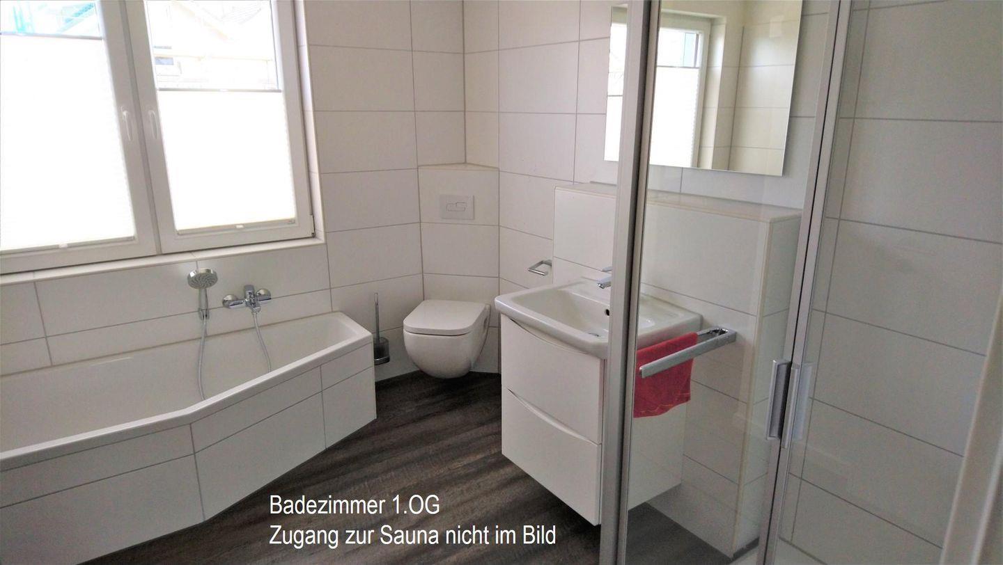 Die erste Etage bietet Ihnen neben dem Schlafzimmer mit Doppelbett, dem Kinder/Jugendzimmer mit zwei einzelnen Betten und einem Balkon, das große Bad mit moderner Regendusche, Badewanne und hauseigener Sauna.