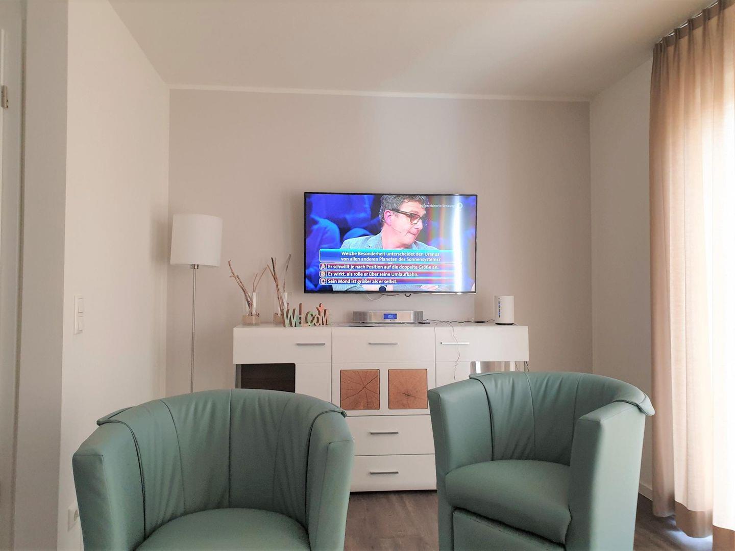 Im hinteren Bereich, zur Terrasse gelegen, steht eine gemütliche Sofaecke mit Fernseher zur Verfügung.