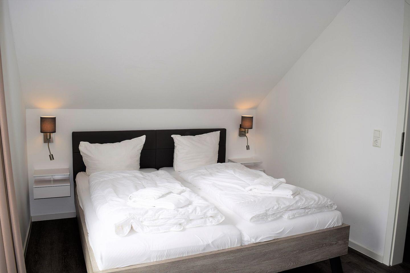 Die erste Etage bietet Ihnen neben zwei Schlafräumen, das große Bad mit ebenerdiger Dusche, Badewanne und Sauna.
