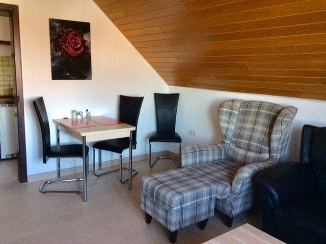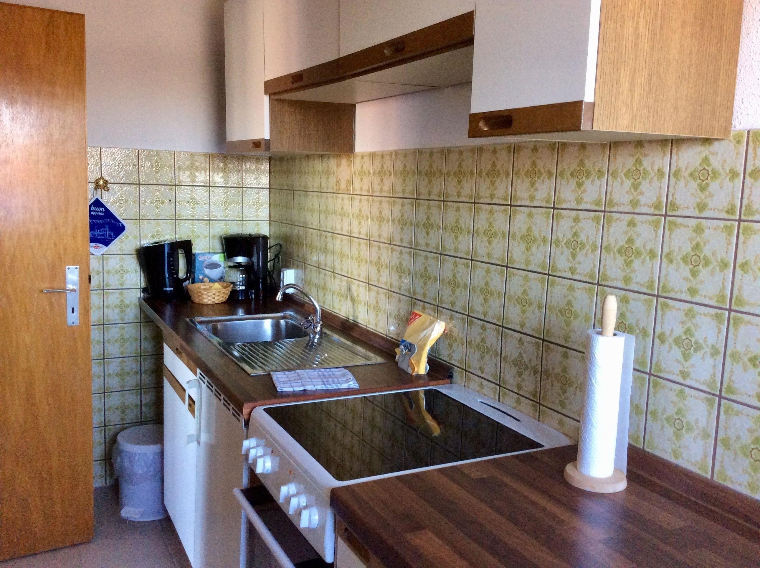 Wohnzimmer mit Sofa,Fernsehsessel,Hocker,Sat-TV,Radio mit CD-Player,Essecke,Küche mit Ceranfeld,Backofen,Kühlschrank mit Gefrierfach,Kaffemaschine,Wasserkocher,Toaster,