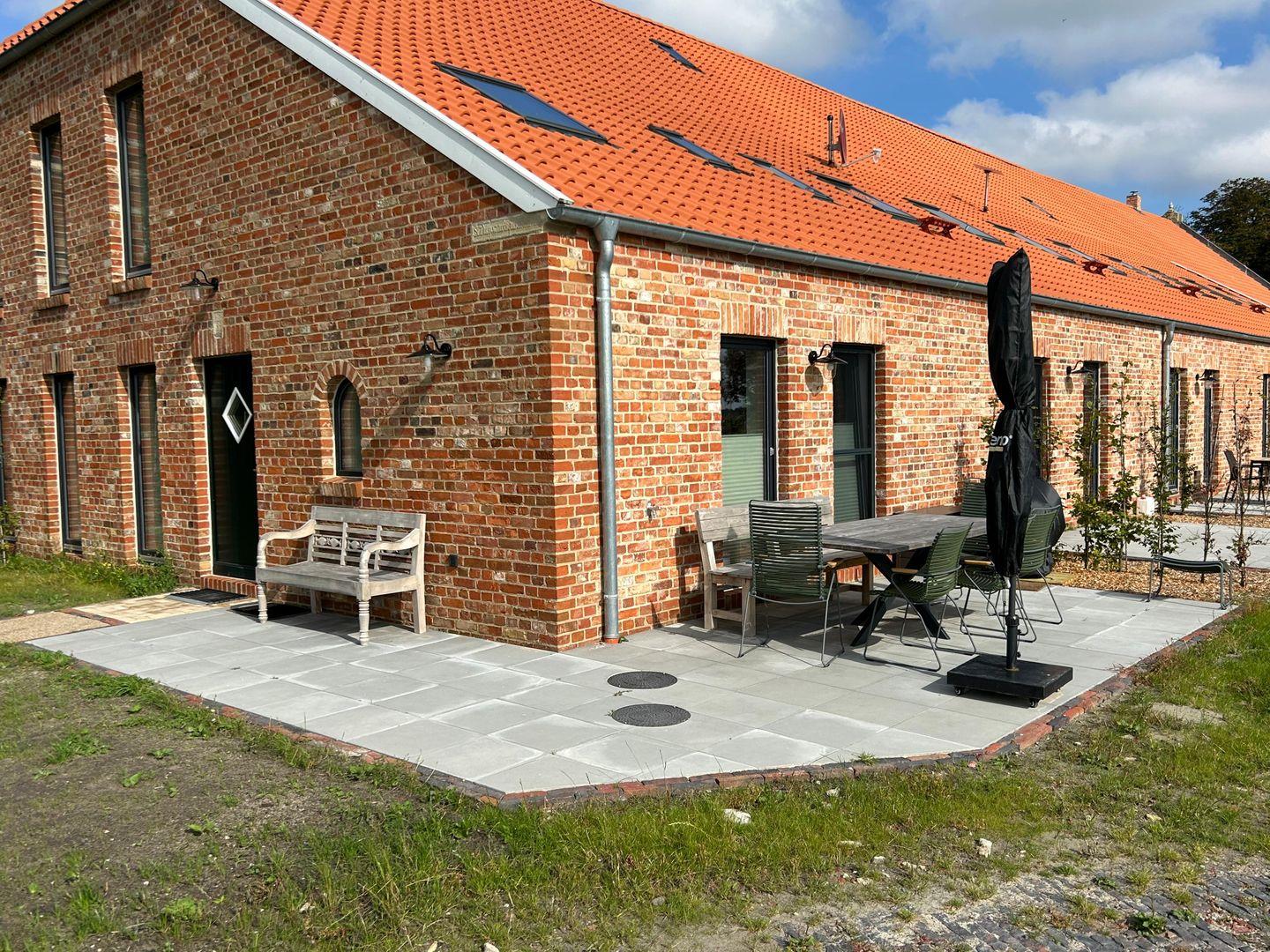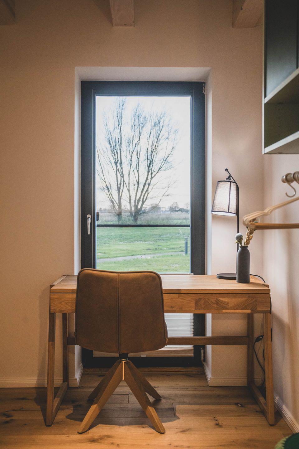 Modern eingerichtete Ferienwohnung Hinnerk´s Huus am Gulfhof mit Sauna, Terrasse und Blick auf nordfriesische Landschaft.