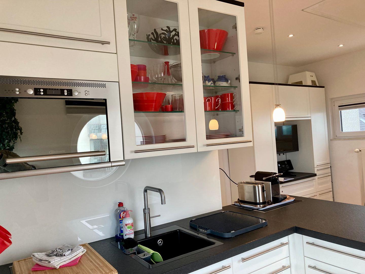 Das Bett lässt sich elektrisch unter die Decke fahren, so dass ein gemütlicher Wohnbereich entsteht. Die Küche ist auch mit allem ausgestattet, was Sie für eine bequeme Selbstverpflegung brauchen. Beim Kochen können SIe den Blick aufs Meer schweifen lassen!