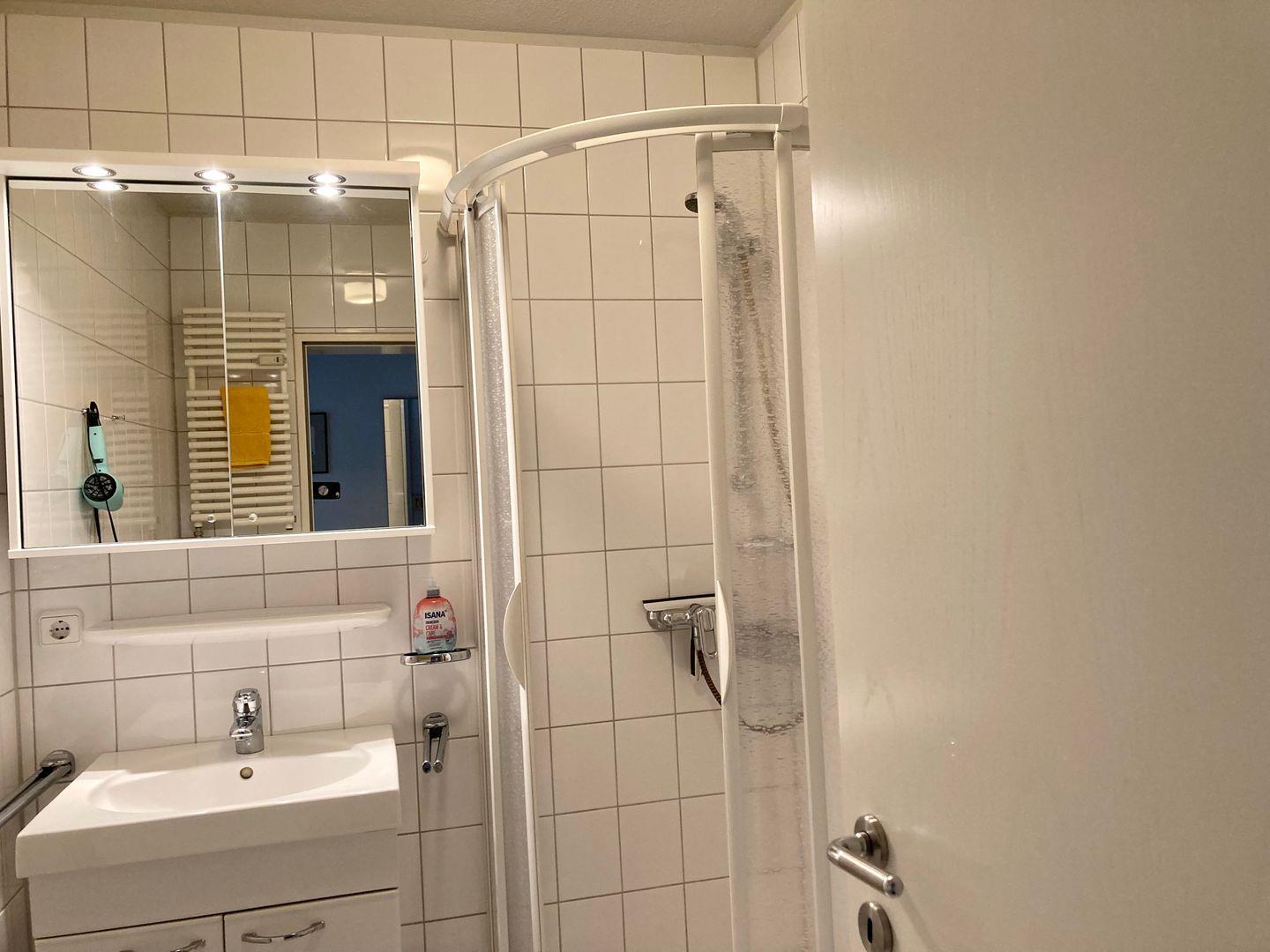 Das Bad hat eine angenehme Größe und auch eine Toplader-Waschmaschine