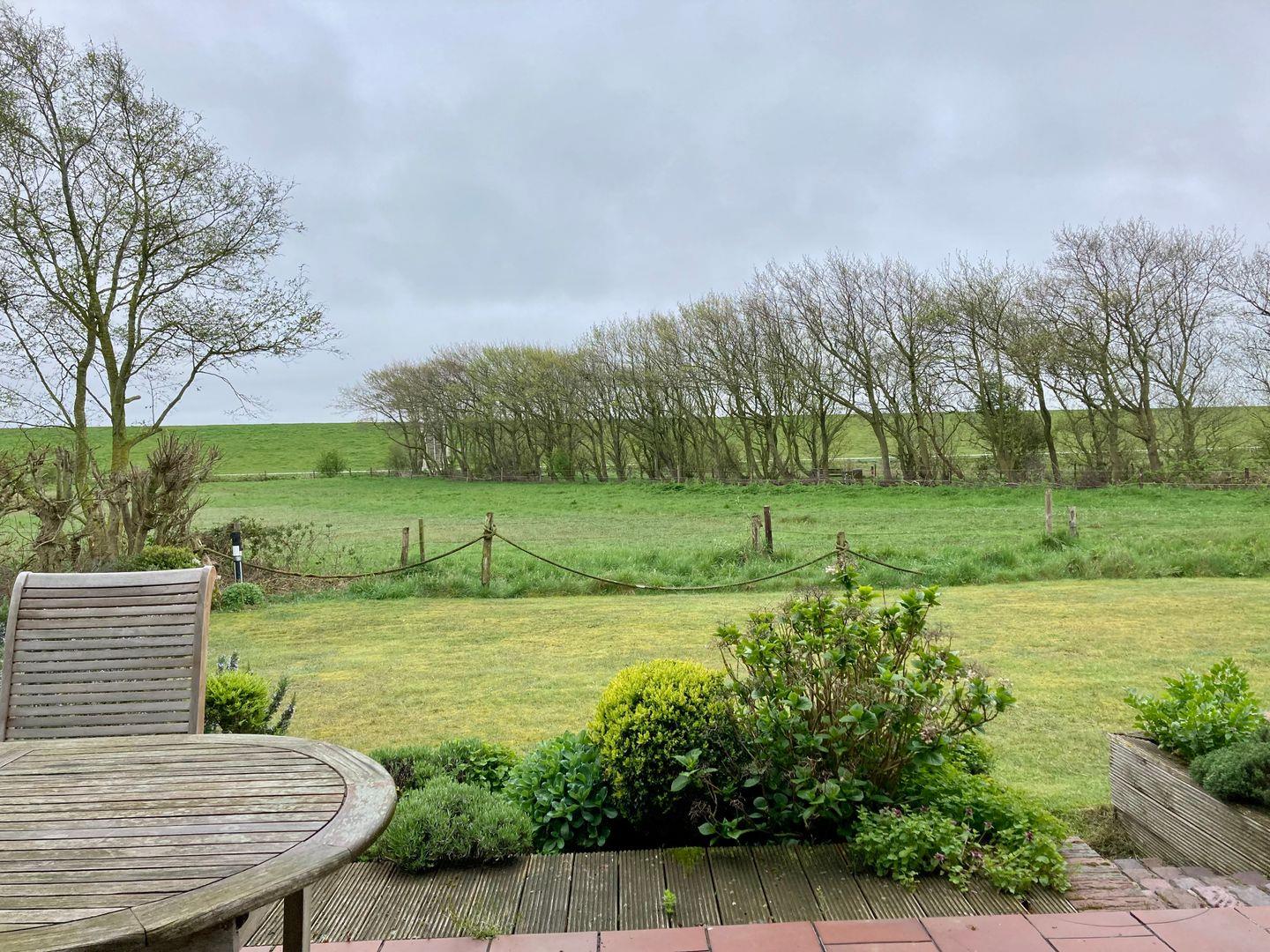 Der Blick fällt von hier aus über eine Pferdekoppel, direkt auf den Deich Richtung Wattenmeer.