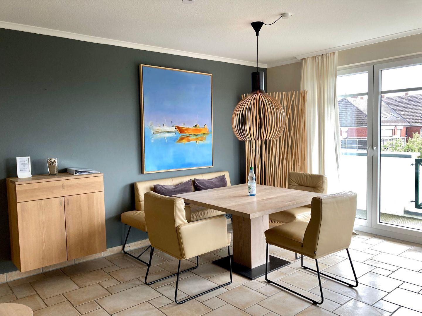 Der Wohn-/Essbereich wurde erst im Oktober/November 2018 modernisiert und besticht nun durch seine leichte, moderne Klarheit. Vom Esstisch hat man einen wunderschönen Blick, über den Balkon, auf die Dünen der Insel Richtung Westen.