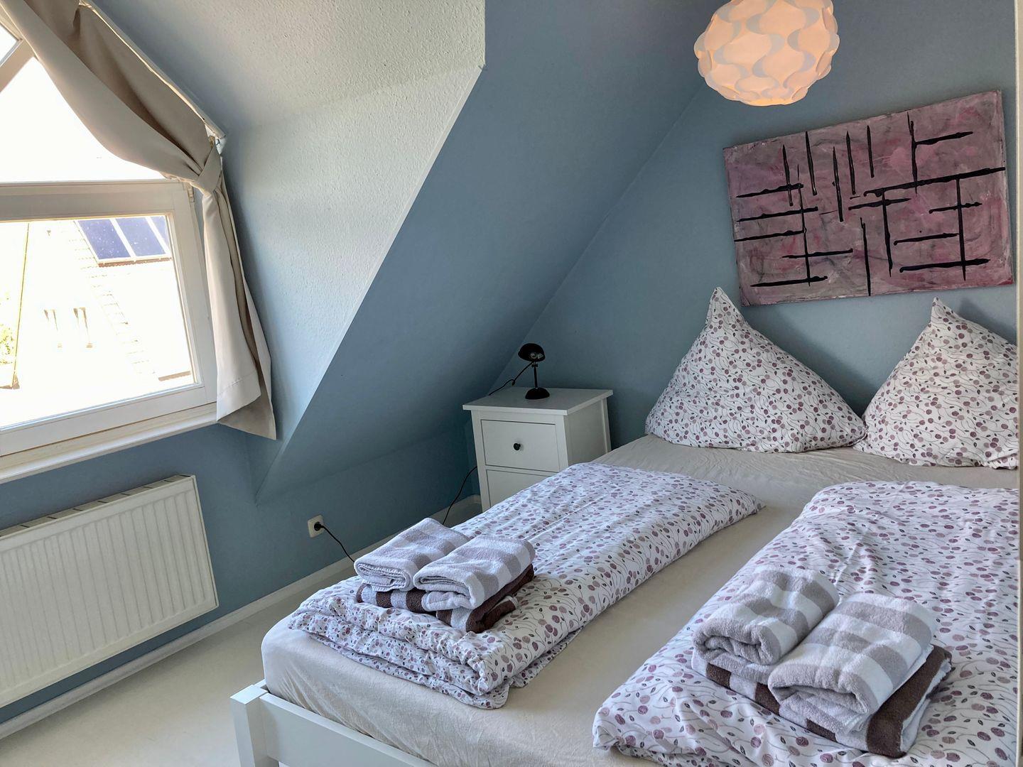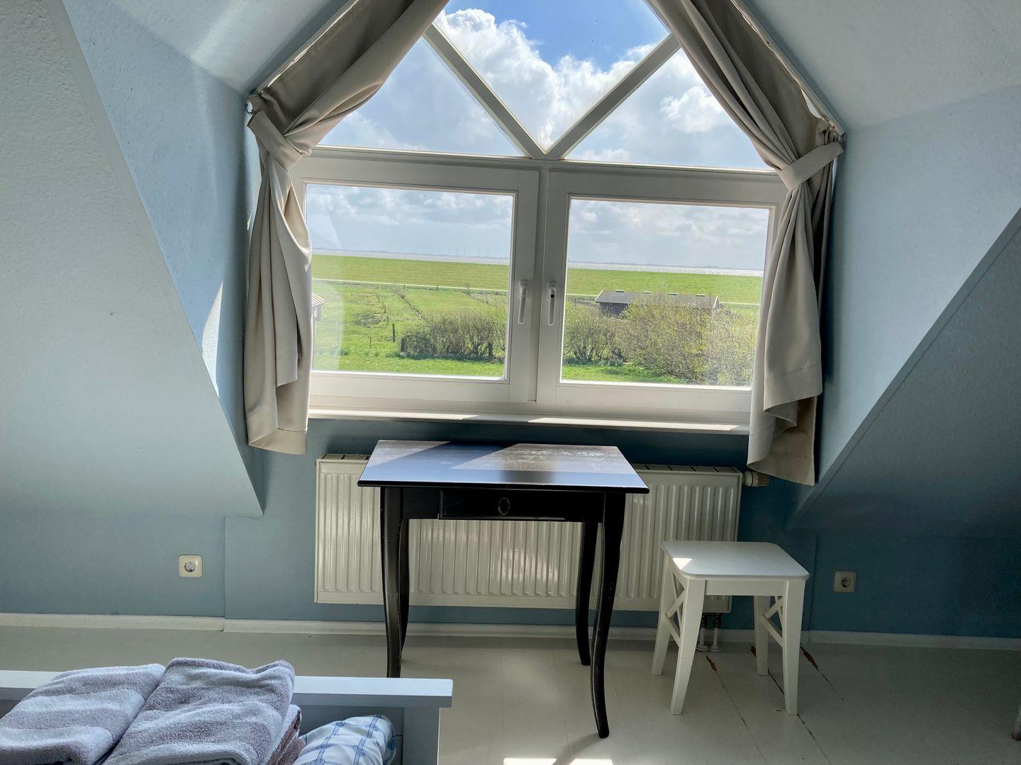 In der obersten Etage sind dann noch 2 weitere Schlafzimmer und ein Duschbad. Das eine Schlafzimmer besticht mit seinem Ausblick aufs Watt, während man bei dem anderen Schlafzimmer unseren Alten Leuchtturm bewundern kann.
