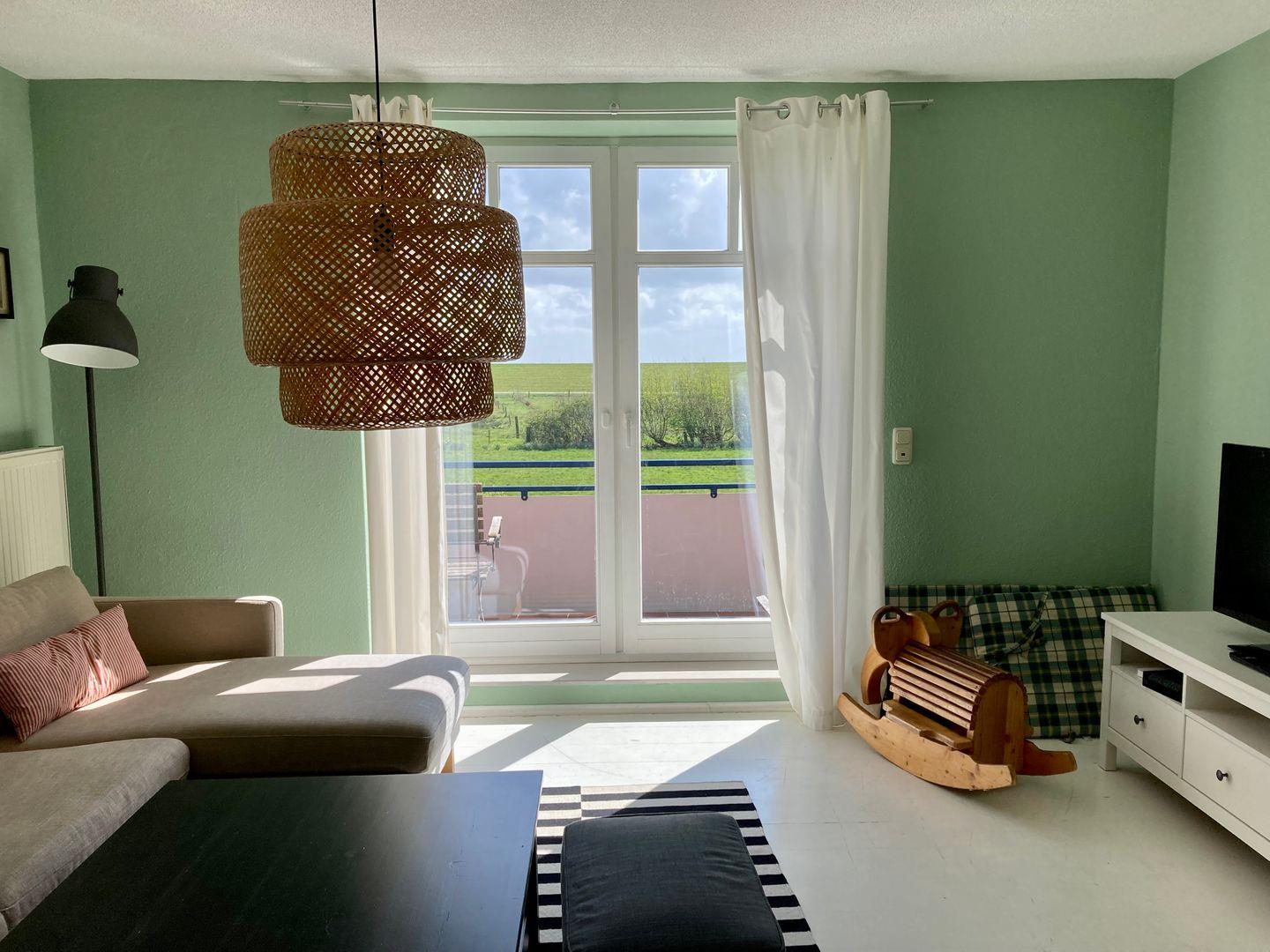 In der 1.Etage ist das helle Wohnzimmer mit angrenzendem "Kinderschlafzimmer"! Dieses verfügt über ein Etagenbett. Im Wohnzimmer befindet sich ein bequemes Sofa, Fernsehsessel und ein Flachbildfernseher mit Kabelanschluss. Auf dem Balkon (Süden) kann man in Ruhe lesen und den Blick übers Wattenmeer genießen!
