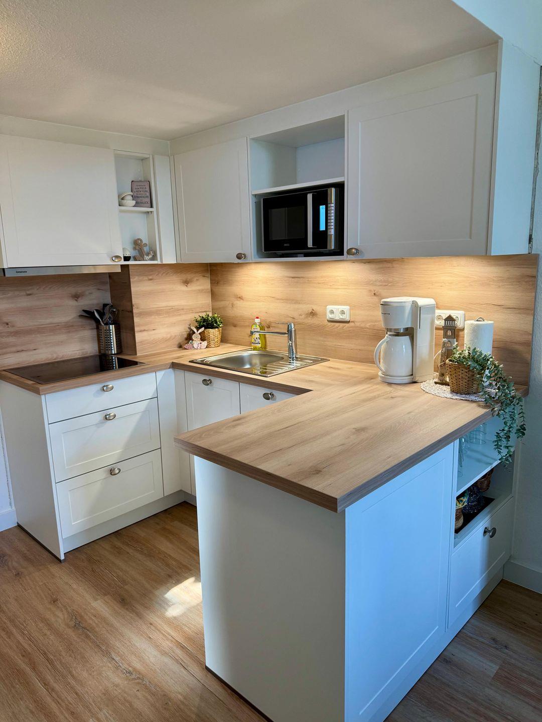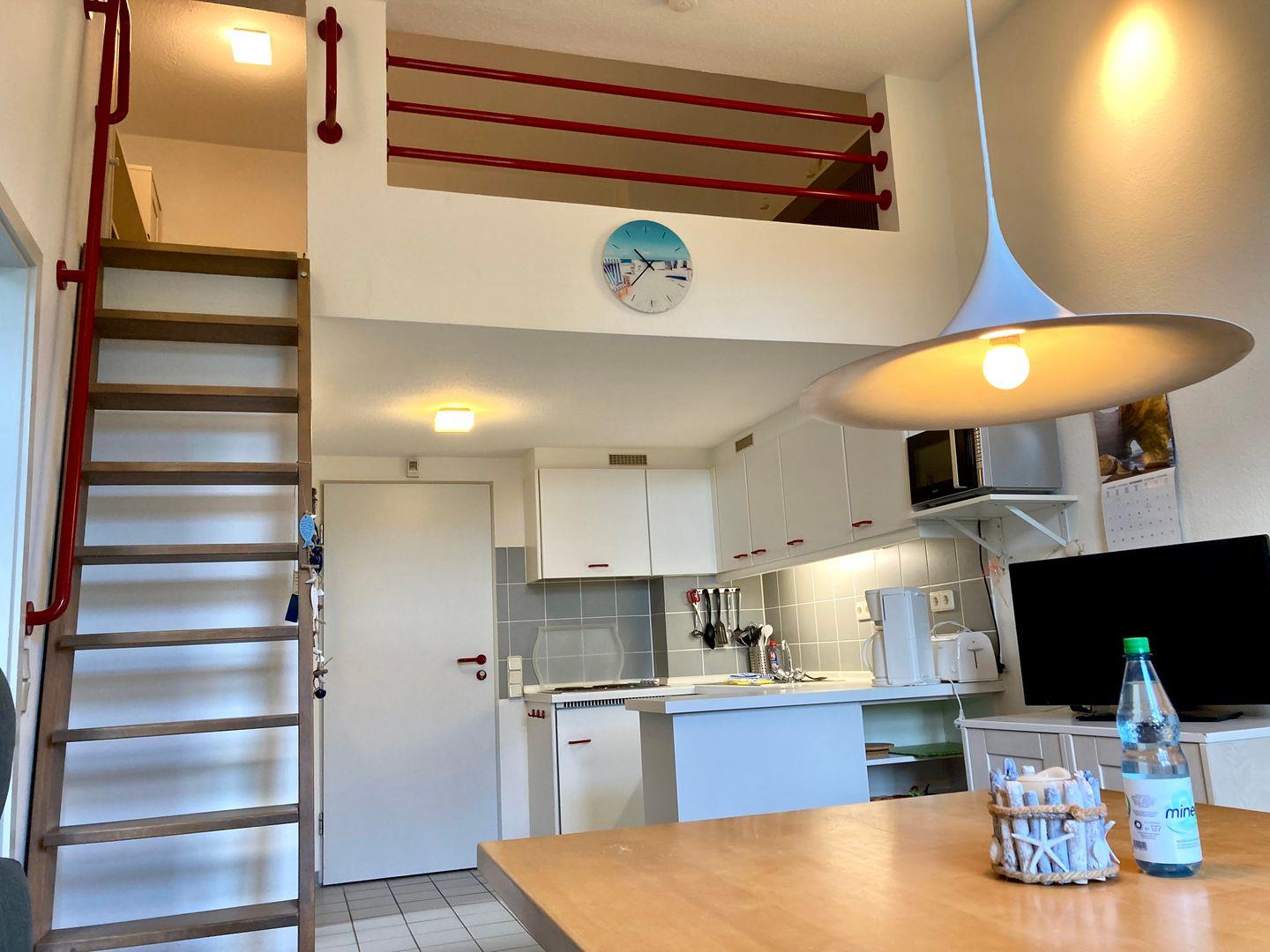 Highlight hier ist der großzügige und urgemütliche Essberbeich mit Blick ins Grüne. Die offene Küche bietet alles, was Sie für eine bequeme Selbstverpflegung benötigen. Quasi über der Küche befindet sich clever gelöst eine Schlafmöglichkeit für 2 Personen, welche über eine Raumspartreppe erreichbar ist