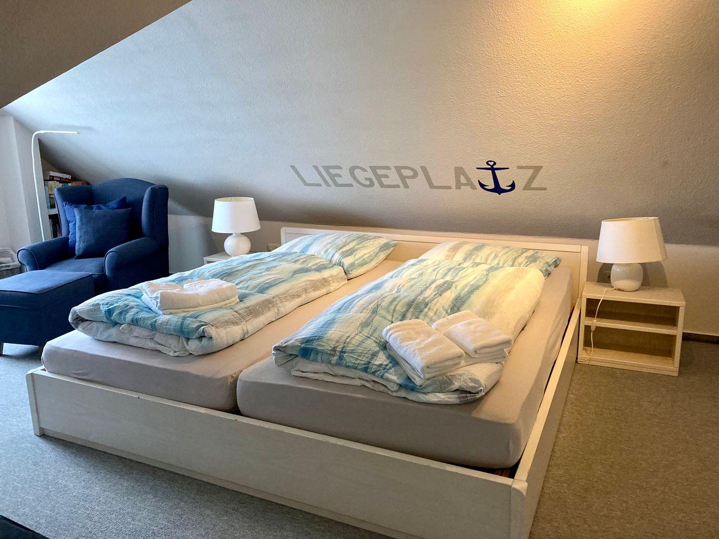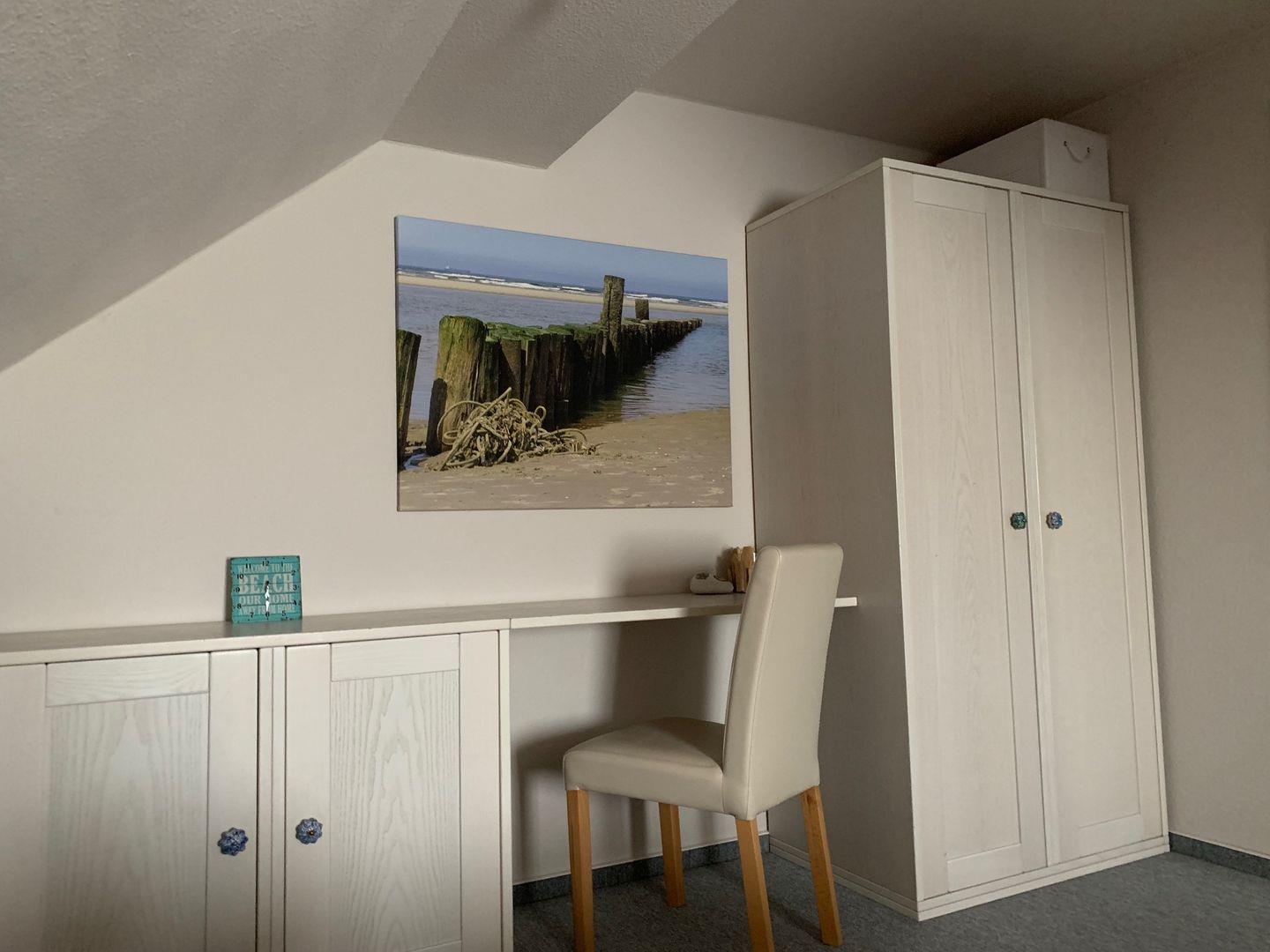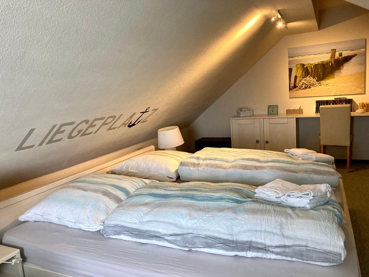Das obere Schlafzimmer verfügt über ein Doppelbett, eine Leseecke mit Sessel u Schreibtisch.