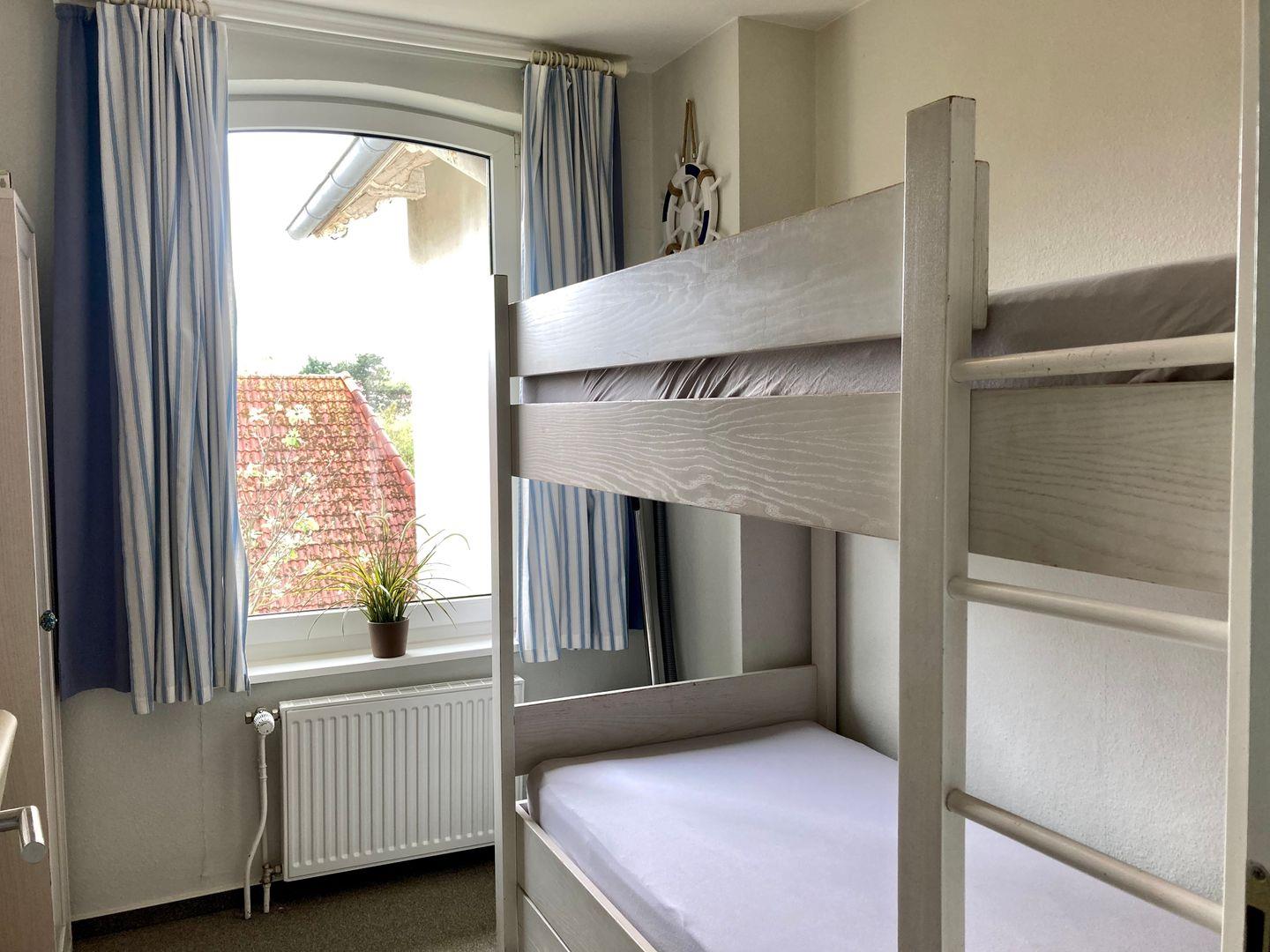 Beim Betreten gelangen Sie in einen Flur, von dem auf der rechten Seite das Kinderzimmer mit Etagenbett und auf der linken Seite das Bad abgehen.