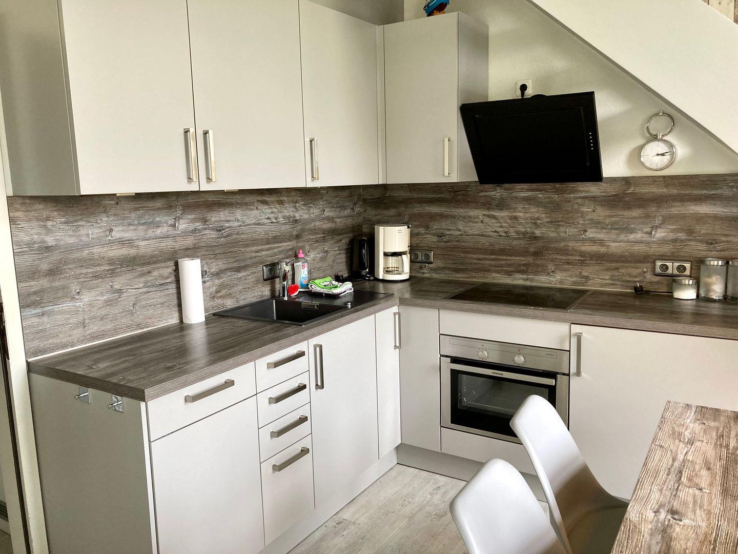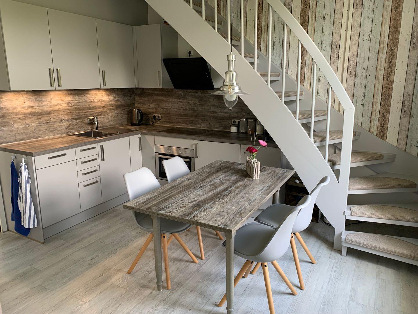 Vom Flur aus kommen Sie dann in den großen Wohnbereich mit bequemen Sofas und Flat-TV. Außerdem befinden sich hier eine komplett ausgestattete Küchenzeile mit Essecke und der Treppenaufgang zum großen Schlafzimmer.
