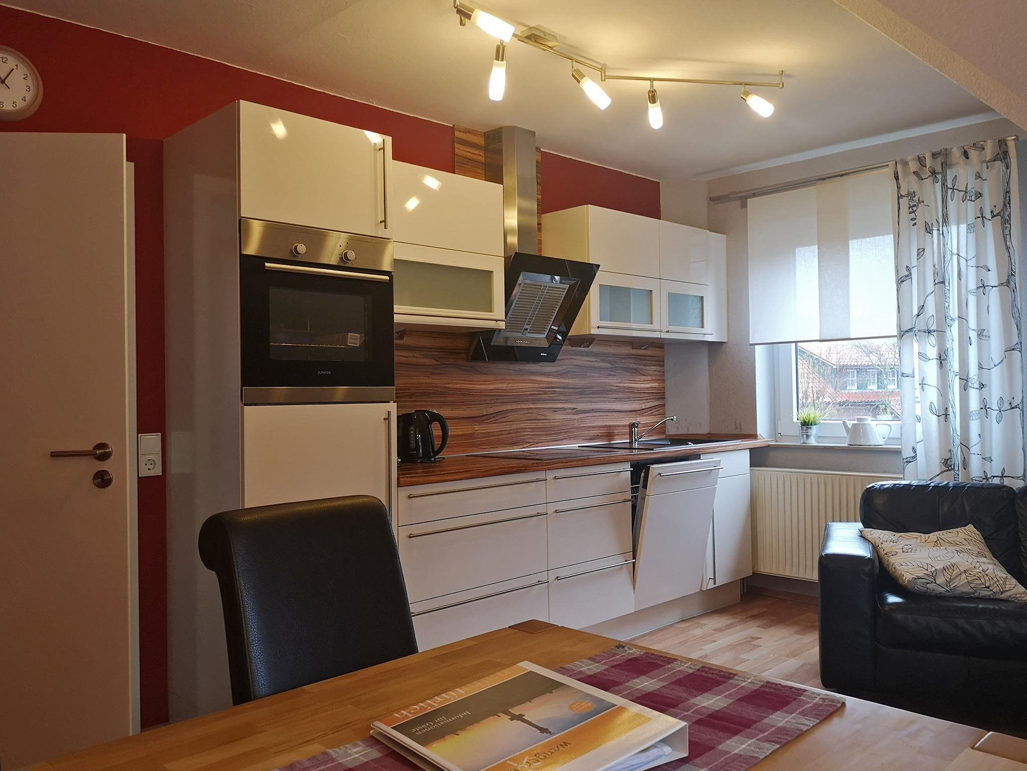 Moderne FeWo für bis zu 5 Personen, Balkon, 47 Flachbild-Sat-TV, Radio/CD-Player, 1 Schlafzimmer mit Doppelbett (180x200 cm), 1 Kinderzimmer mit stabilem Etagenbett (unten: 140x200 cm, oben: 90x200 cm). 2 Sessel zusätzlich vorhanden. Sehr großes Bad mit Wanne u. Dusche, Miele-Waschmaschine, Babybett und Hochstuhl, Wohn-Essküche mit Backofen und Geschirrspülmaschine, umfangreiche Küchenausstattung; Tresor; WLAN im Haus verfügbar; Freisitz mit Sitzmöbel für 6 Personen; Erstattung Wäschepakete.