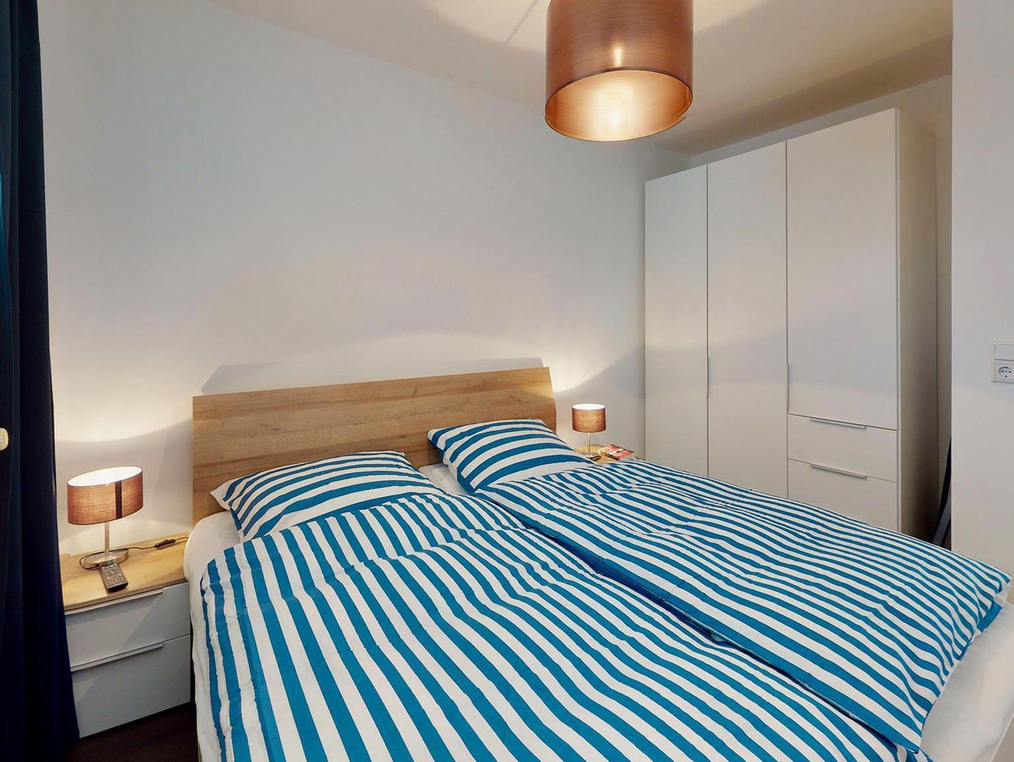 2 Zimmer. Küche. Bad. Balkon. Das Schlafzimmer ist mit einem Doppelbett und einem Schrank ausgestattet. Ein Wohnessbereich mit offener, umfangreich ausgestattete Küche mit Induktionsherd, Backofen, Kühl-Gefrier-Kombination, Spülmaschine, Mikrowelle und Kaffeemaschine, lädt zum Kochen ein. Ob essen, fernsehen oder auf der Couch sitzen, ein großer Tisch und ein gemütliches – zum Doppelbett umfunktionierbares – Sofa bieten im Wohnbereich Platz. In der Sonne frühstücken kann man auf dem Ost-Balkon.