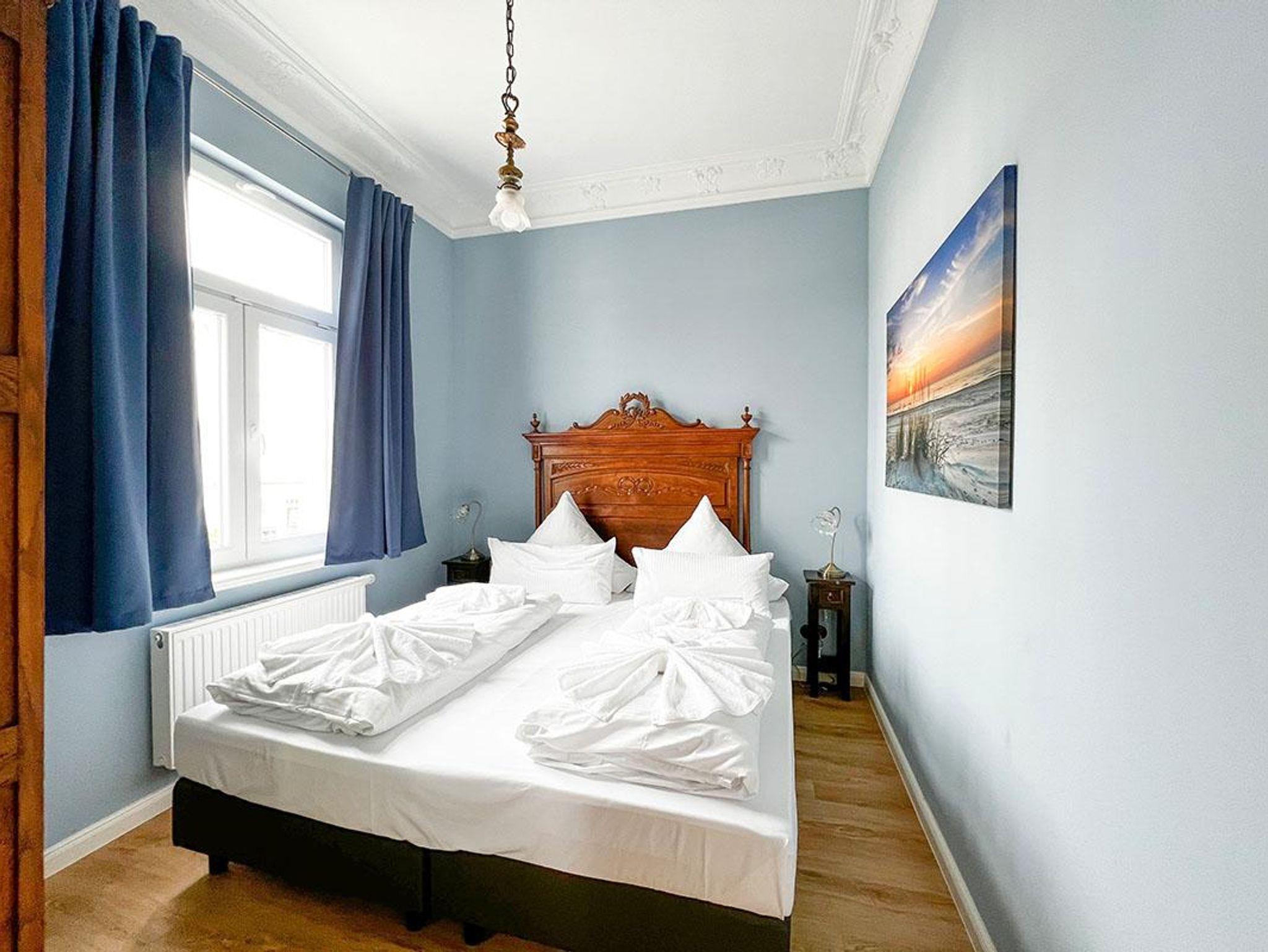 Die Architektur sowie die hochwertigen, restaurierten Möbel aus der Zeit der Jahrhundertwende vermitteln ein reizvolles Jugendstil-Ambiente, was es so auf der Insel kein zweites Mail gibt. Gleichzeitig ermöglicht Ihnen eine moderne technische Ausstattung, Ihren Alltag in gewohntem, zeitgemäßem Komfort zu führen. In den Betten, für die wir eine hochwertige Hotel-Qualität gewählt haben, werden Sie erholsamen Schlaf finden. Die Wohnung Strandläufer verfügt über hohe Decken, Blick zum Meer und weiten Blick über die Ortsstraße.