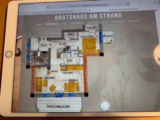 Unser Friesenhaus "Bootshaus am Strand" verfügt über 4 Wohnungen. Die Wohnung 4 befindet sich im 1. Obergeschoss und verfügt darüber hinaus über eine Empore im Spitzboden die als Schlaf- oder Spielstätte für Kinder oder weiteren Besuch vorgesehen ist. Die Wohnung hat eine große nach Süden ausgerichtete Dachterrasse, von der aus Sie das friesische Wattenmeer betrachten können. Ein Gartenhaus bietet Platz für Ihre Fahrräder oder Wassersportgeräte.