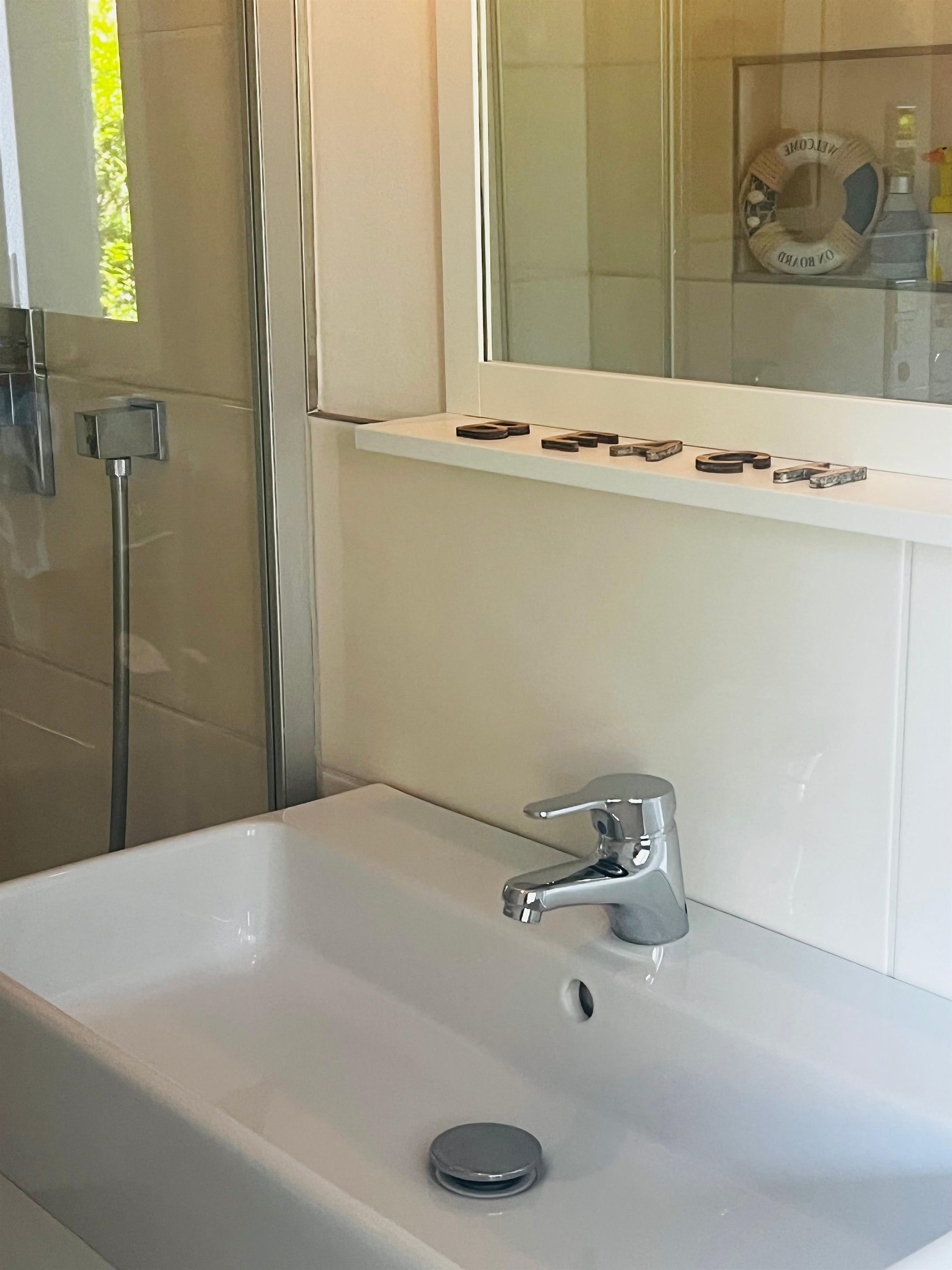- Modernes Bad, mit integriertem Radio, Regendusche und bodengleicher Dusche