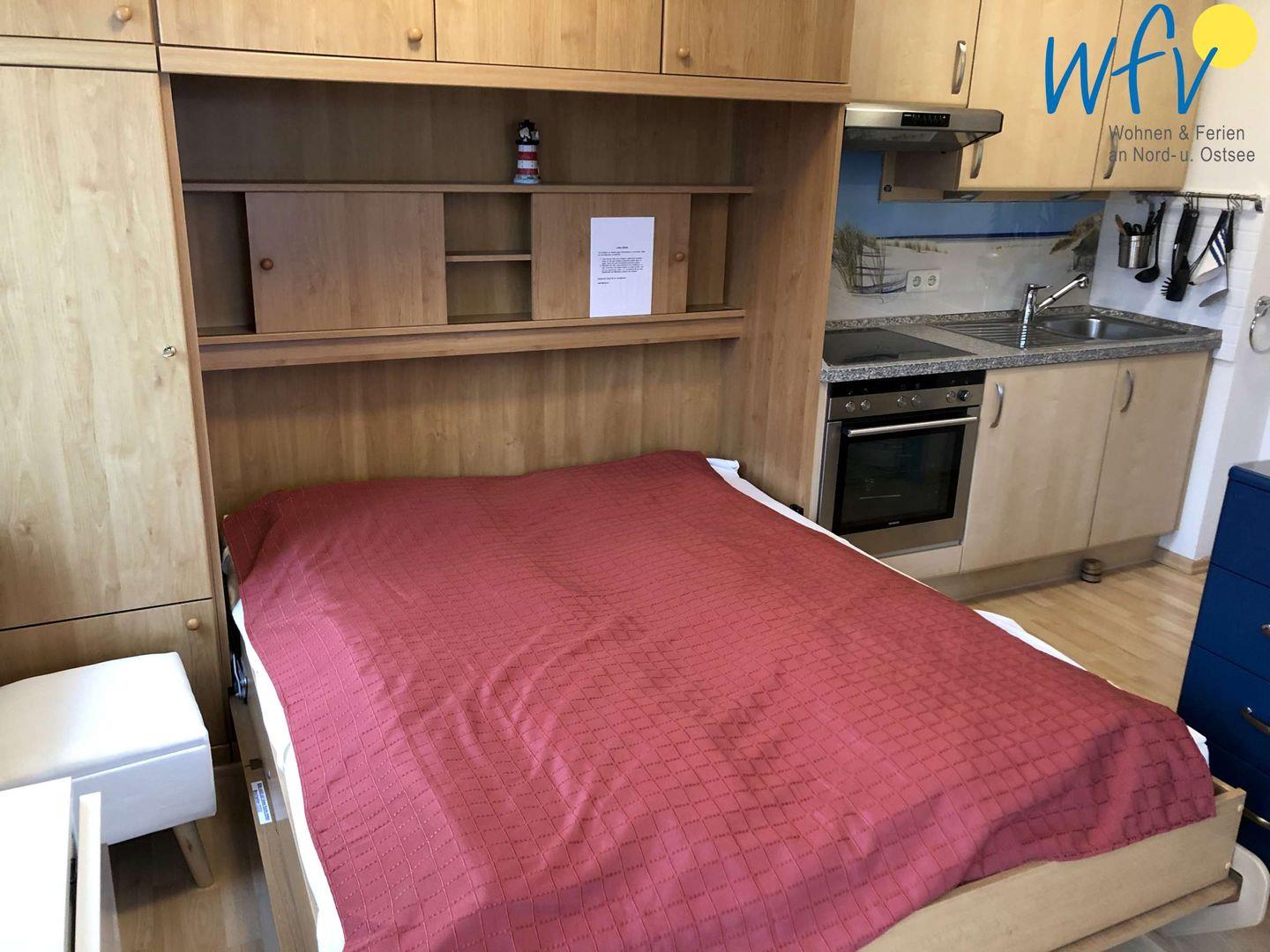 Auf optimal genutzten 20 m² Wohnfläche erwartet Sie ein Wohn- /Schlafraum mit Schrankbett (2 x 80 x 200 cm), ein kleiner Essbereich und eine integrierte Kochnische sowie ein Duschbad und ein Abstellraum.