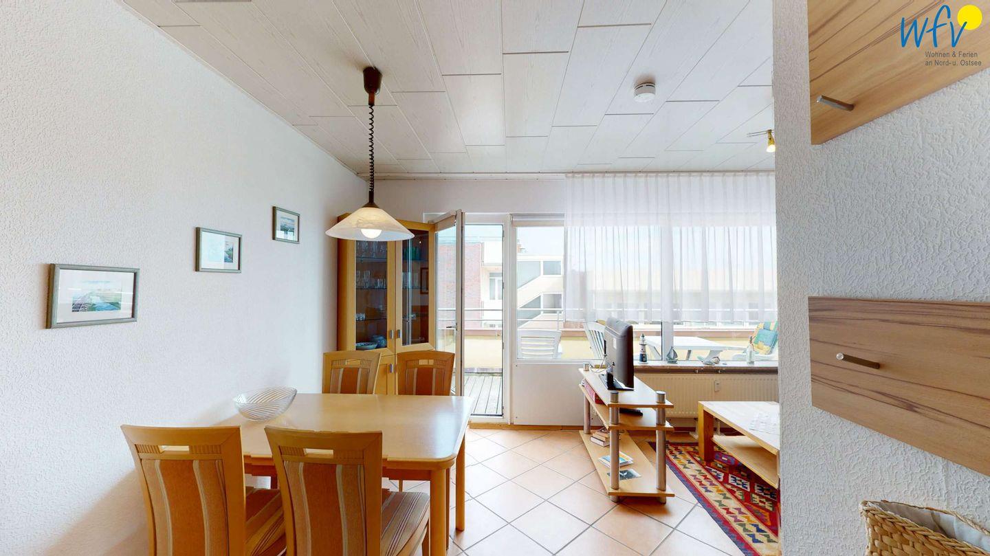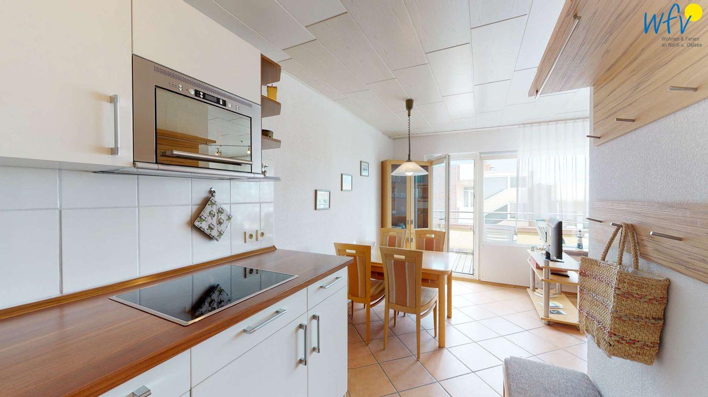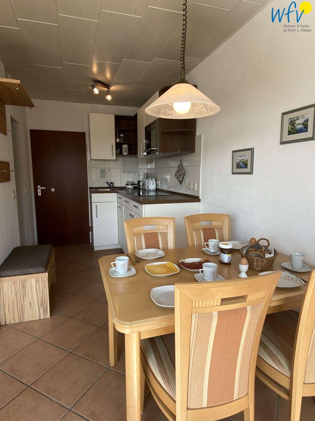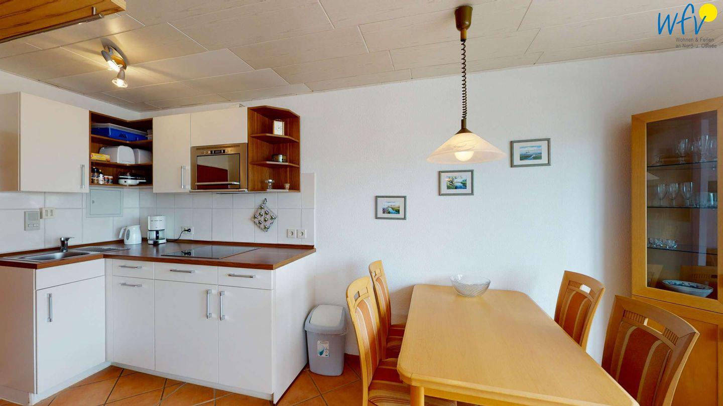 Damit Sie sich in Ihrem Urlaub auf Wangerooge bequem selbst verpflegen können, verfügt die Ferienwohnung über eine gut ausgestattete Einbauküche - u.a. mit Ceranherd, Mikrowelle und Spülmaschine. Gemeinsame Mahlzeiten können Sie an dem großen Esstisch einnehmen.
