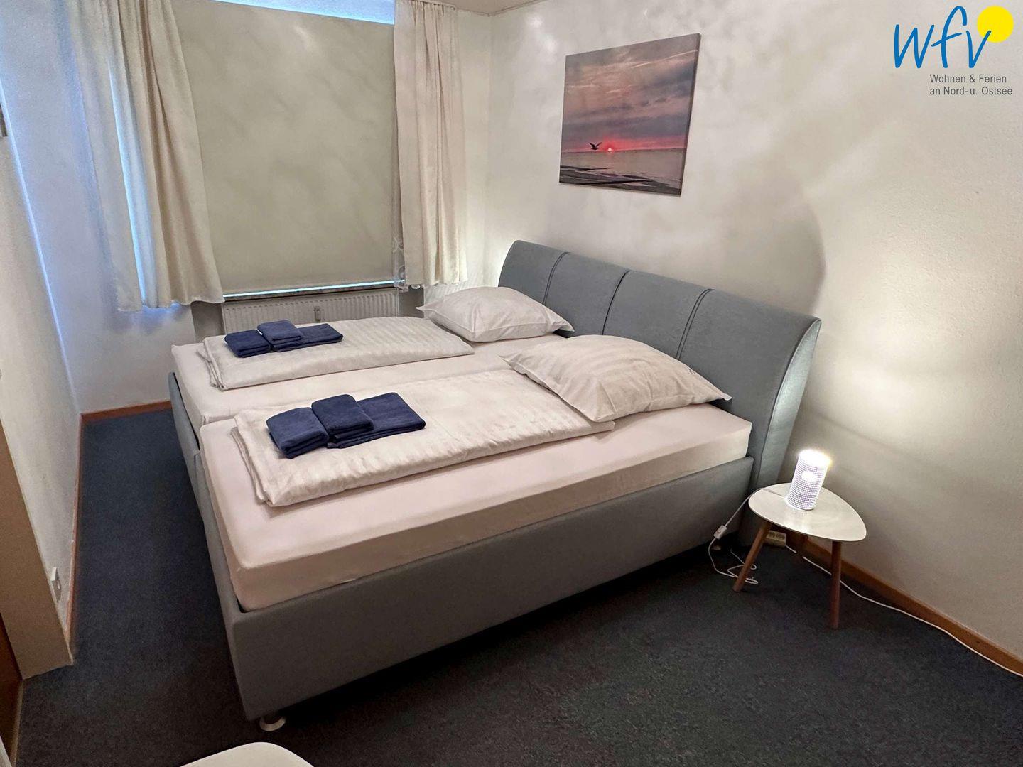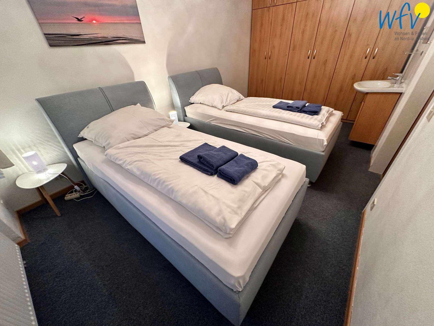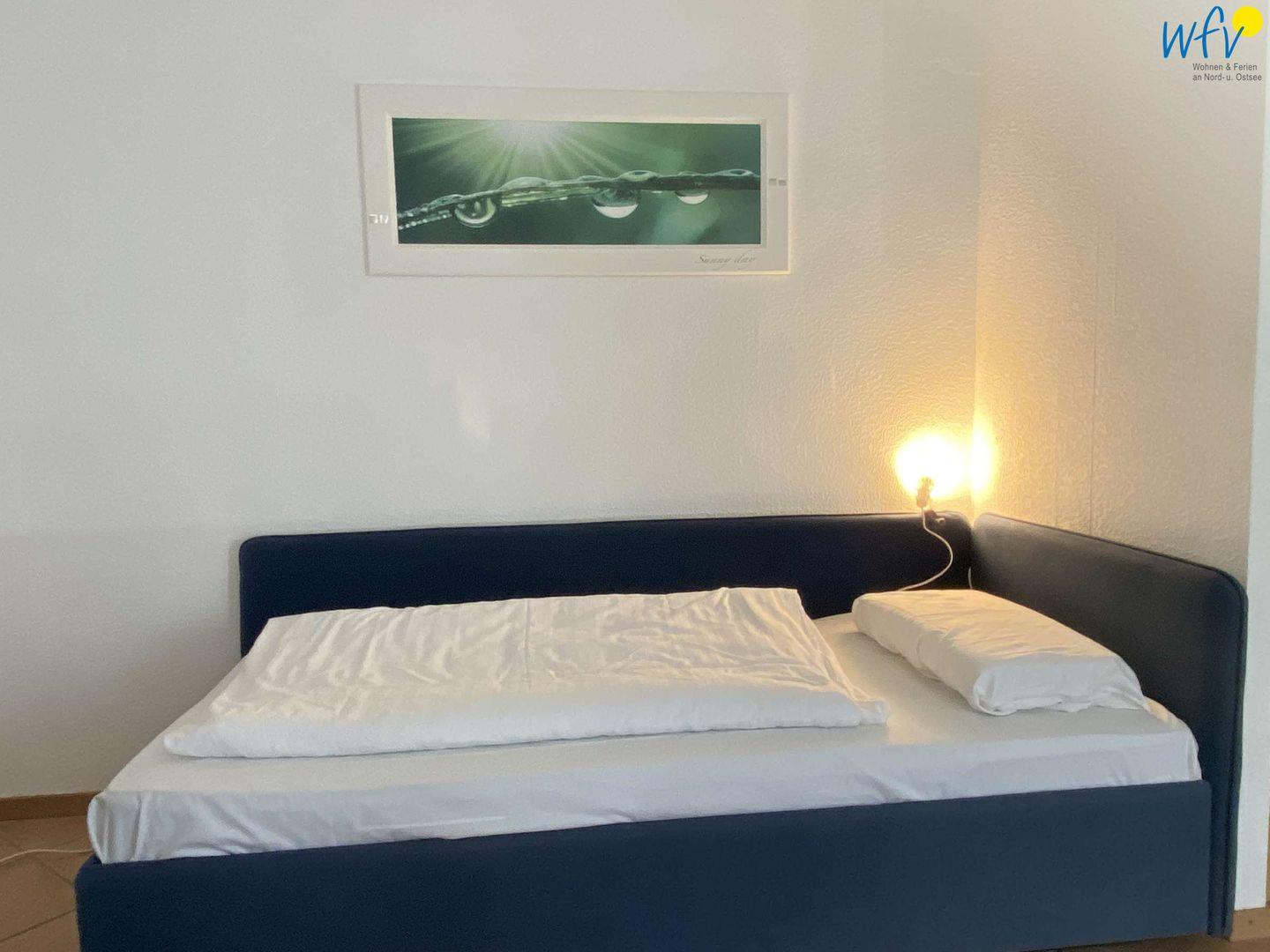 In dem separaten Schlafzimmer der Ferienwohnung befinden sich zwei komfortable Einzelbetten (90 x 200 cm). Für eine angenehme Nachtruhe können beide Zimmer selbstverständlich verdunkelt werden. .In der Wohnküche befinden sich zwei Einzelschlafsofas 0,8 x 1,9 m, die im Mai 2022 neu installiert wurden.