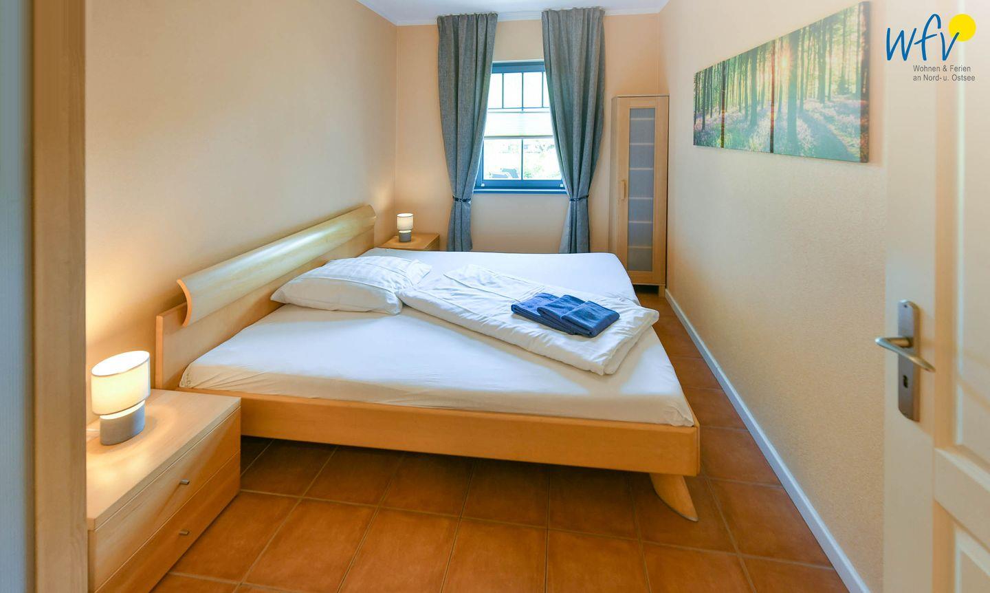 Schlafmöglichkeiten bestehen in der Ferienwohnung durch zwei separate Schlafzimmer. Eines der Zimmer ist mit einem komfortablen Boxspringbett (1,80 m) und einem breiten Kleiderschrank ausgestattet. Das andere mit einem Doppelbett (1,70 m) und einer Schrankwand.