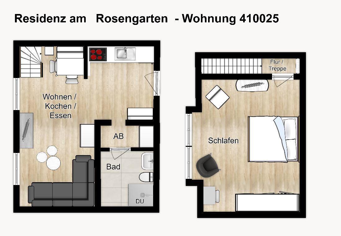 Sie haben Platz auf 2 Etagen! Im unteren Bereich befindet sich ein geräumiger Wohnraum, der mit einer offenen Küche und Essplatz zu gemeinsamen Mahlzeiten einlädt. In der bequemen Couchecke mit TV können Sie in vollen Zügen relaxen!