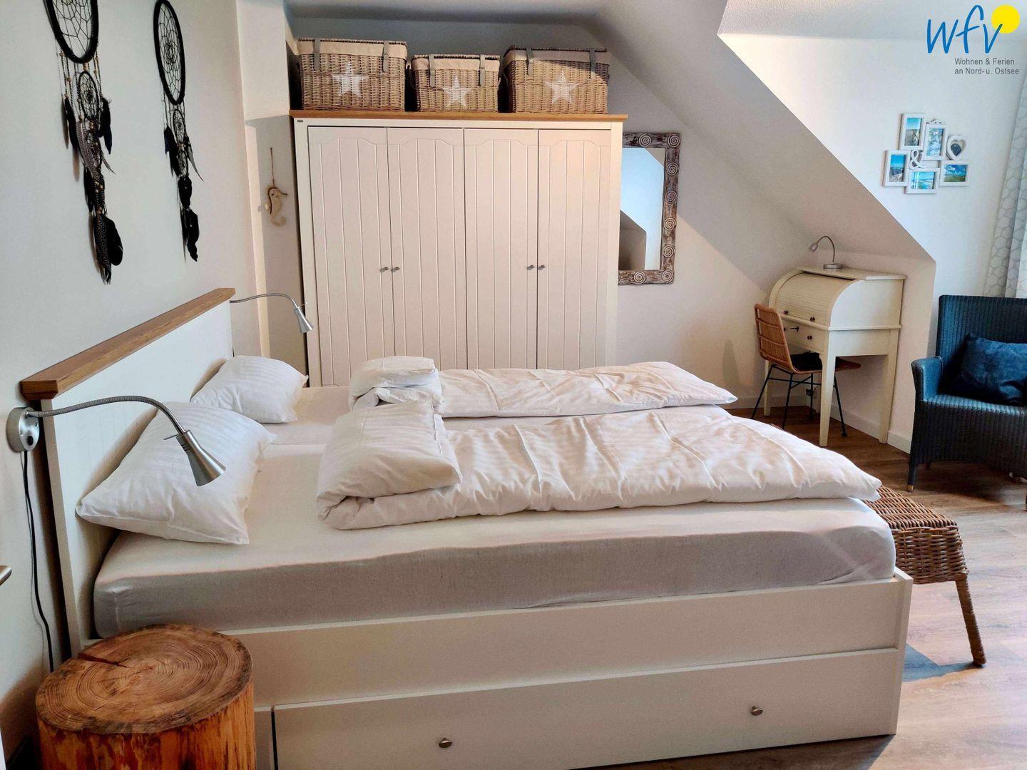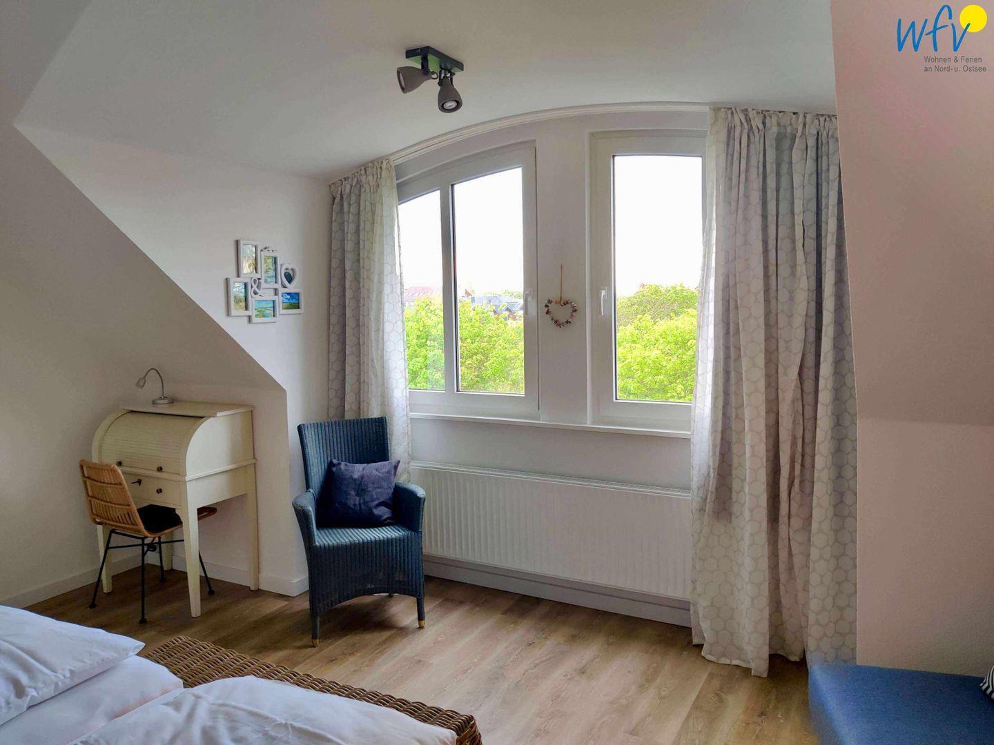 In dem oberen Bereich der Ferienwohnung auf Wangerooge erwartet Sie ein separates Schlafzimmer, das mit einem komfortablen Doppelbett (2 x 90 x 200), einem geräumigen Kleiderschrank, einer Kommode mit TV und einem kleinen Schreibtisch ausgestattet ist. Ein ausziehbarer Schlafsessel (80 x 200) bietet eine weitere Schlafmöglichkeit (für Kinder). Durch die großen Fenster und den schönen Blick ins Grüne werden Sie bereits beim Aufstehen entspannt in den neuen Urlaubstag starten!