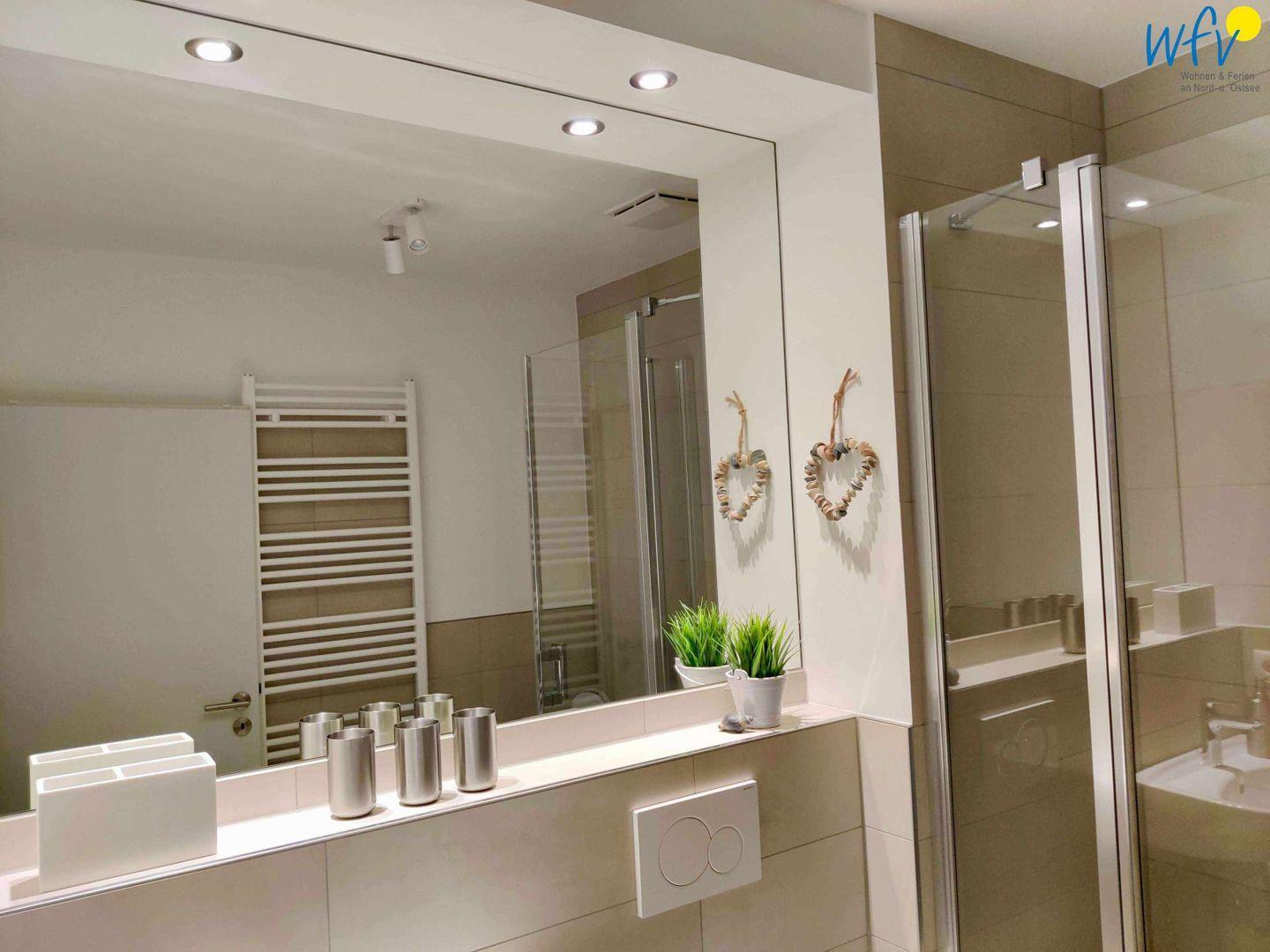 Für gehobenen Wohnkomfort sorgt auch die Ausstattung des modernen Badezimmers - u.a. eine Glas-Dusche, ein großer Wandspiegel und eine Handtuchheizung.
