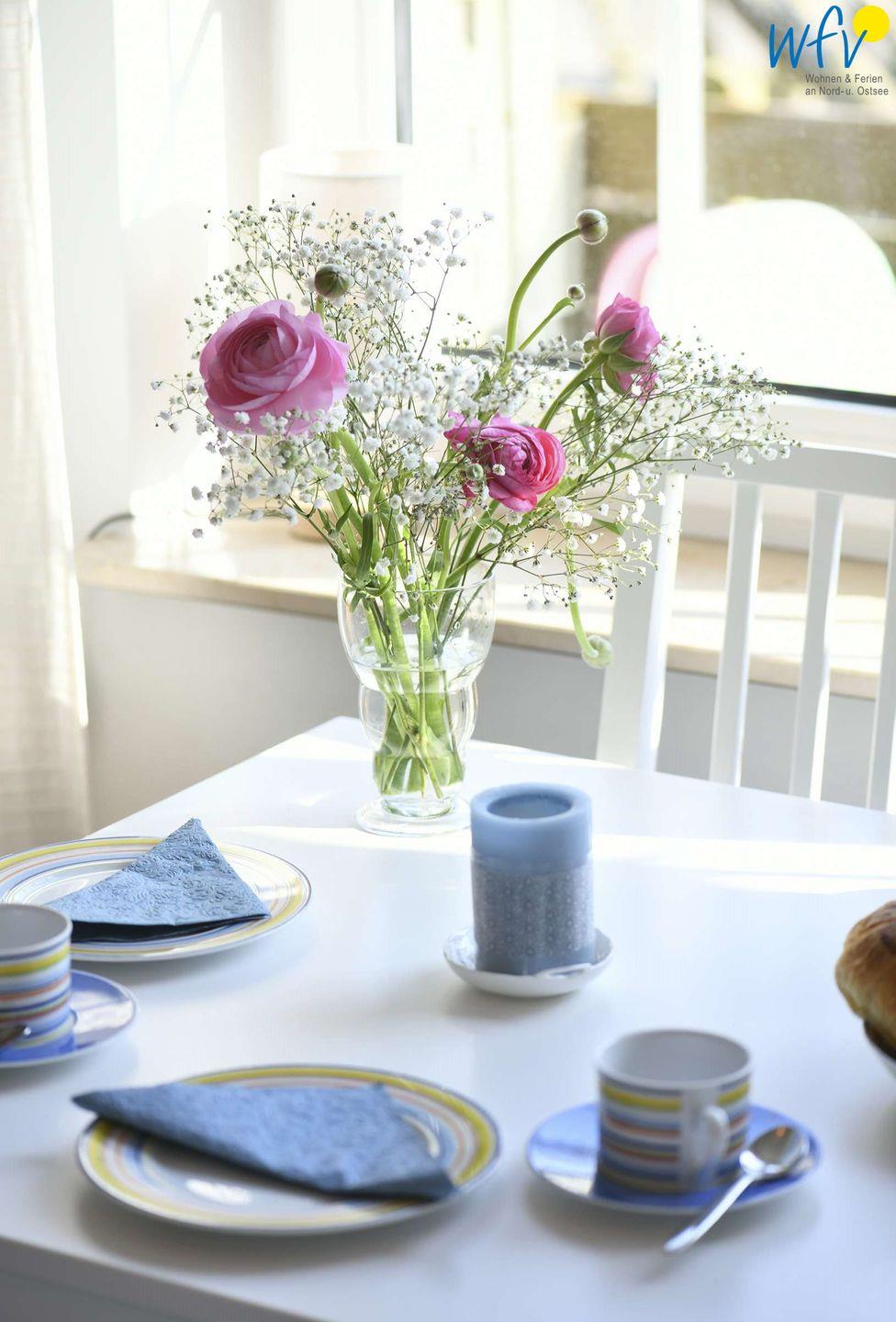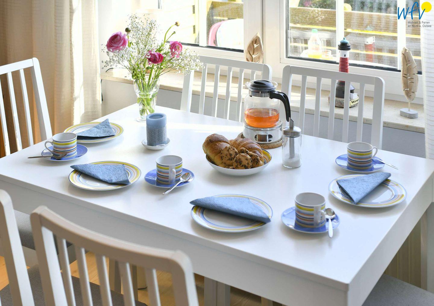 Bereits beim Frühstück genießen Sie vom Essplatz am Fenster aus einen herrlichen Blick ins Grüne! Da bekommt man direkt Lust, einen ereignisreichen Urlaubstag in Wangerooges malerischer Naturlandschaft zu planen: mit Badespaß am Strand, Fahrradtouren durch die Dünen oder Ausflügen zu Sehenswürdigkeiten! (Der Esstisch ist ausziehbar.)