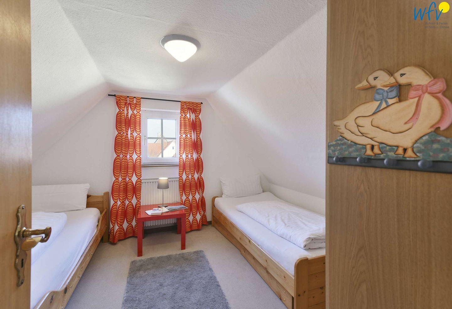 Drei separate Schlafzimmer bieten Ihnen angenehme Rückzugsmöglichkeit bei einem Wangerooge-Urlaub mit mehreren Personen. Im ersten Geschoss erwartet Sie ein großzügiges Schlafzimmer mit Doppelbett (2 m) und sonnigem Südblick sowie ein weiteres Schlafzimmer - mit neuem Doppelbett (1,40 m), Kommode und Schiebetür. Auf dieser Etage befindet sich das Duschbad. Im Spitzboden liegt das dritte Schlafzimmer, das mit zwei Einzelbetten (90 cm) eingerichtet ist. Alle Schlafzimmer können verdunkelt werden.