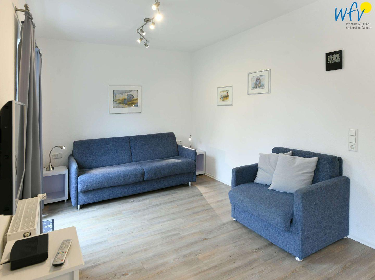 Gemütliche Stunden können Sie in dem geräumigen Wohn-/Schlafraum verbringen, der u.a. mit einem Sofa, einem Sessel (beide mit integrierter Schlaffunktion) und einem TV sowie mit einem Esstisch ausgestattet ist.