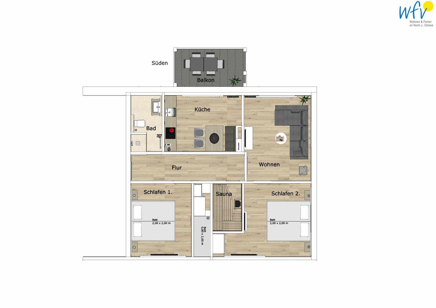 Zwei separate Schlafzimmer bieten Ihnen angenehme Aufteilungsmöglichkeiten, der große Wohnraum lädt zu herrlichen Relaxmomenten ein, die topmoderne Küche macht die Selbstverpflegung zum Kinderspiel und sowohl auf dem sonnigem Balkon, als auch in der wohnungseigenen Sauna ist Ihnen Erholung garantiert!