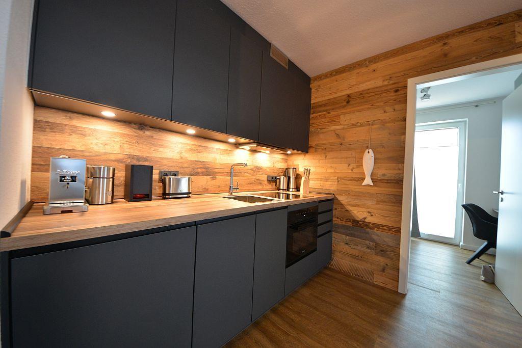 Die Wohn-Esszimmer-Kombination mit Luxusküche im STRAND | PIET lädt zum Kochen und Verweilen ein. Die Küche Ihrer Ferienwohnung ist komplett mit Miele-Einbaugeräten ausgestattet, inklusive Backofen und Mikrowelle. Zur hochwertigen Ausstattung gehört auch eine original italienische Espressomaschine mit Kaffeepads und einem Milchaufschäumer.