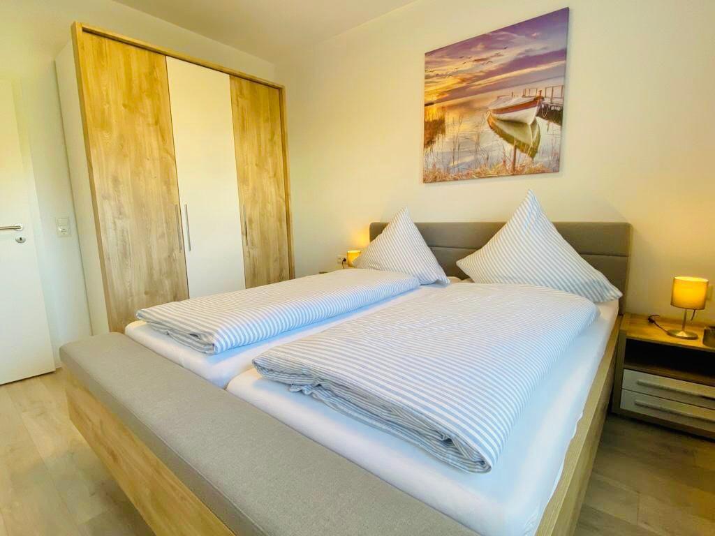 Das Schlafzimmer überzeugt Sie mit einem komfortablen Doppelbett (200 x 200 cm) und einem weiteren HD-TV.