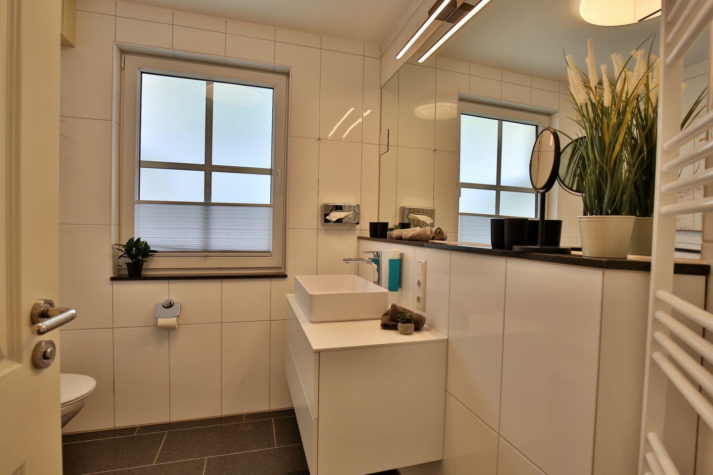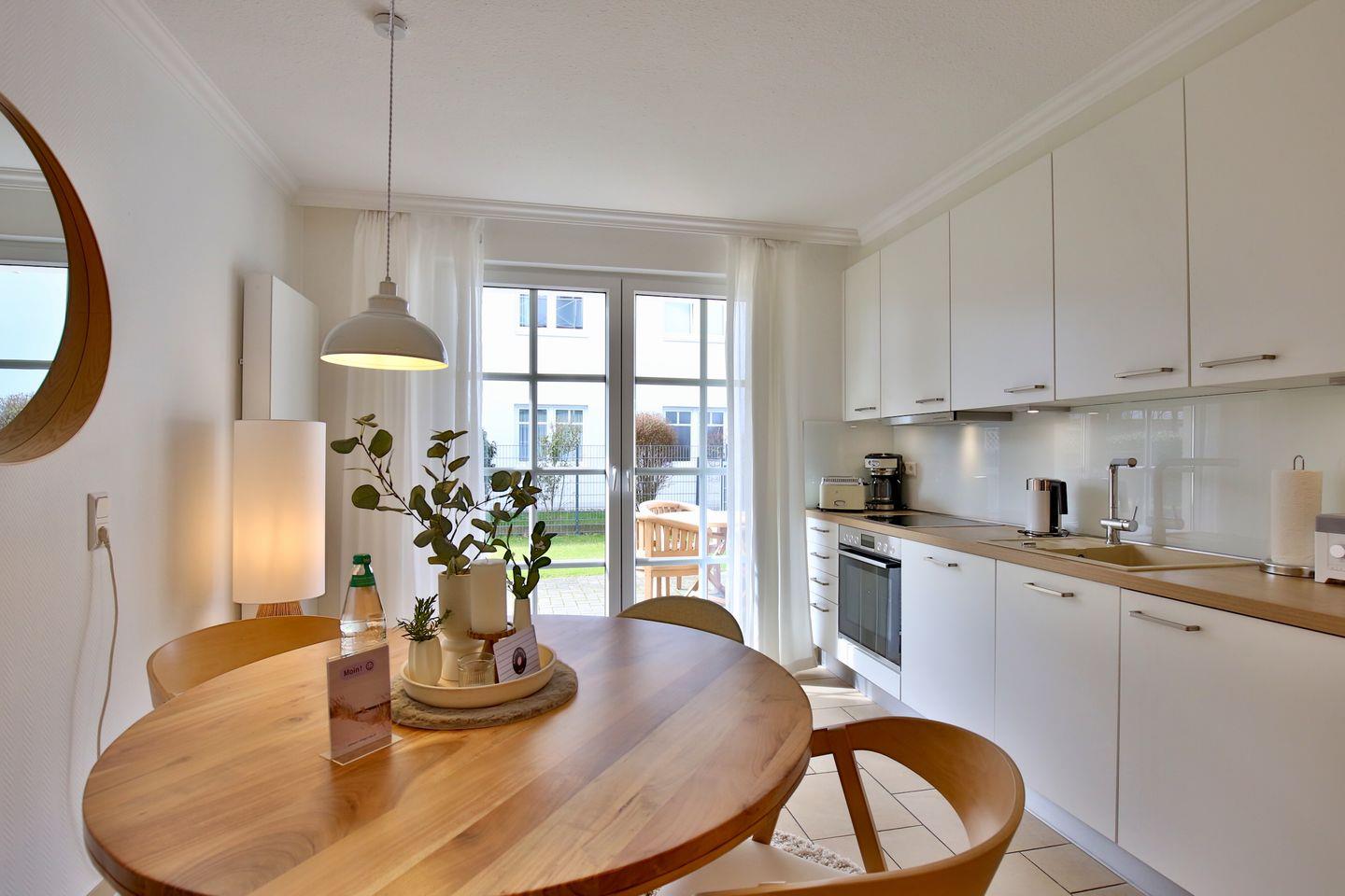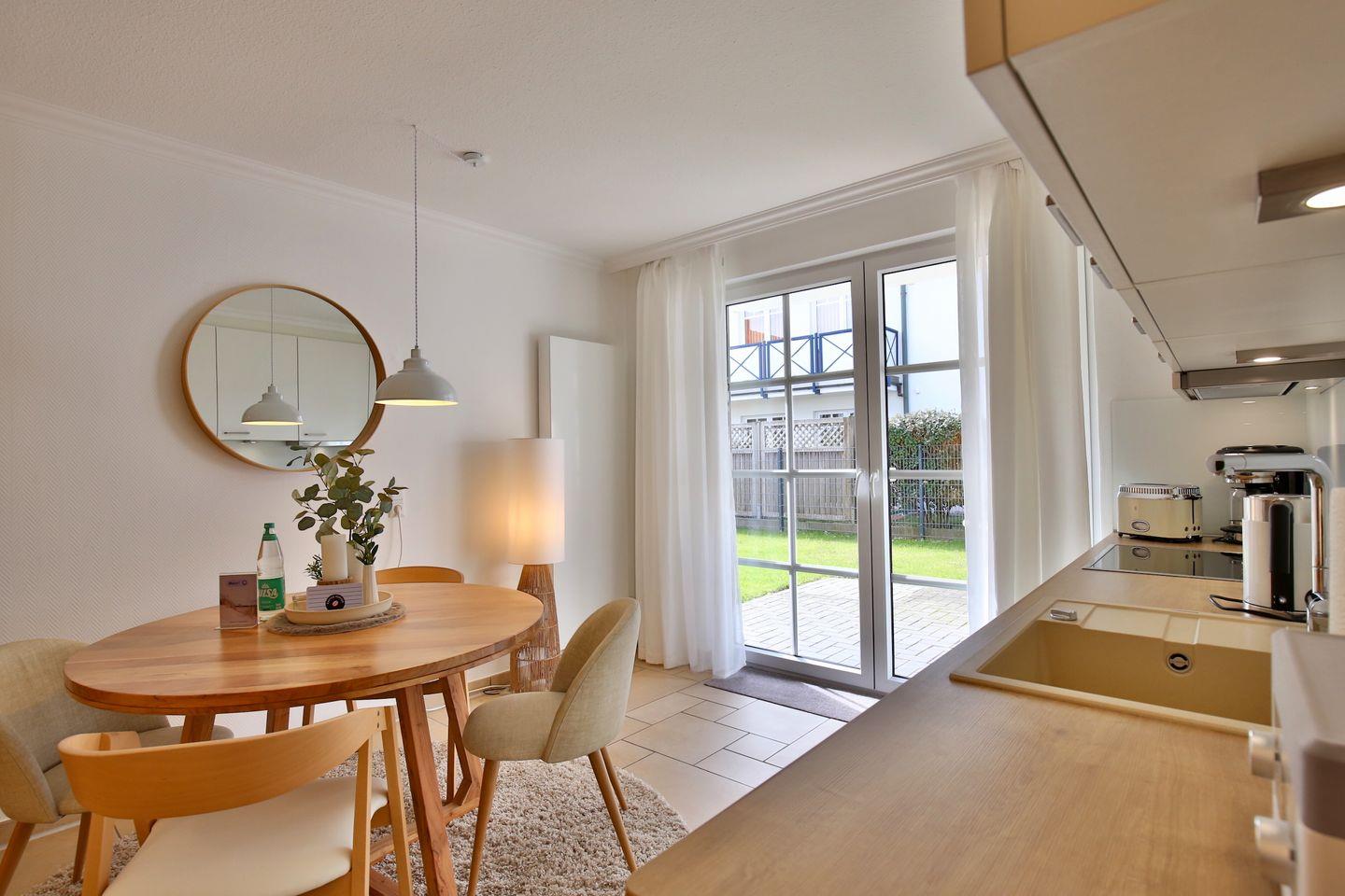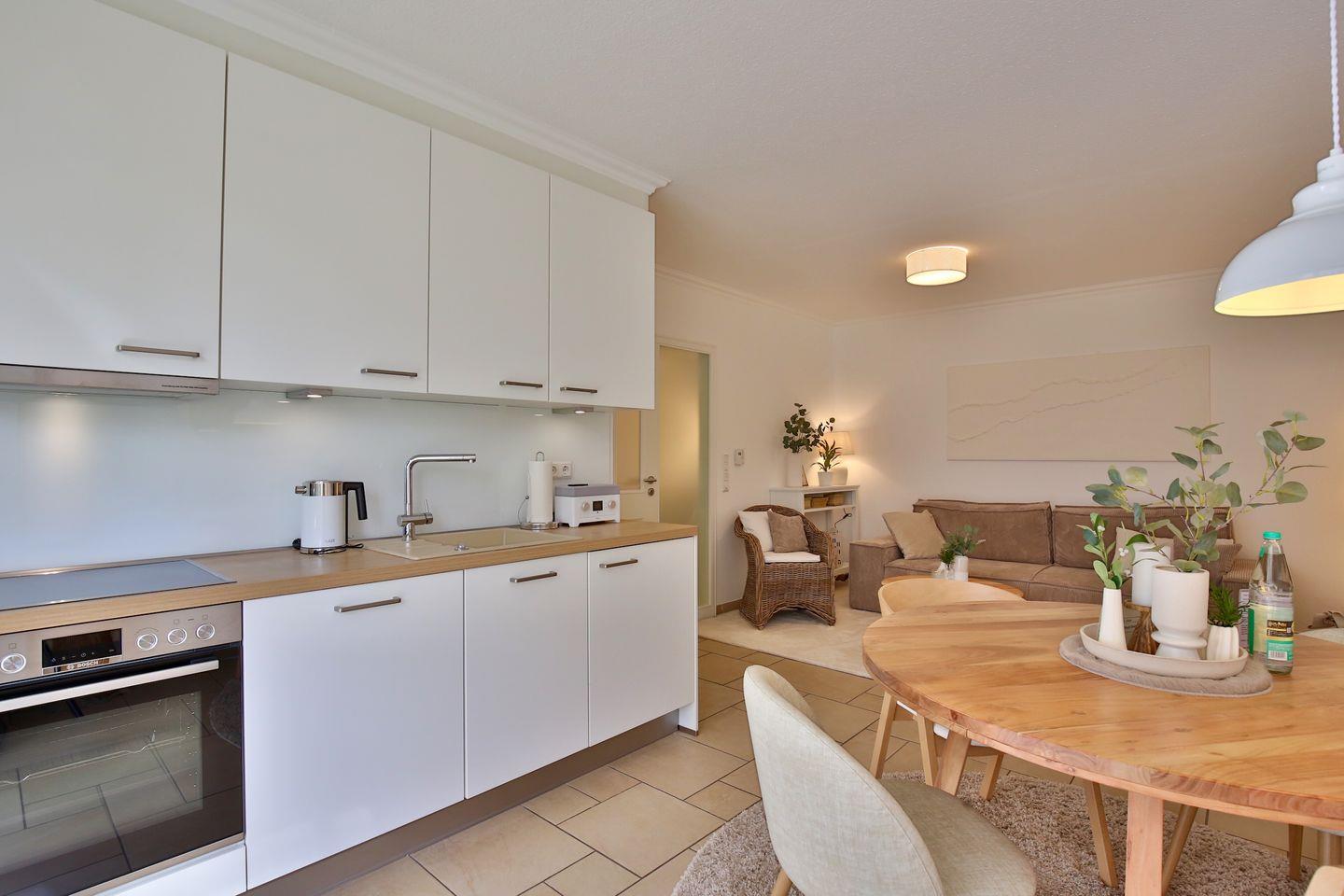 Direkt neben der offenen Küchenzeile befindet sich der stilvolle Essbereich. Hier können Sie es sich zu viert am Esstisch gemütlich machen und genussvoll speisen. An den Esstisch lässt sich bei Bedarf auch ein Kinderhochstuhl stellen. Zwischen dem Essbereich und der Wohnzimmerecke wurde der Smart-TV installiert. Dieser lässt sich so drehen, dass Sie vom Esstisch wie auch von der gemütlichen Sofaecke aus fernsehen können.